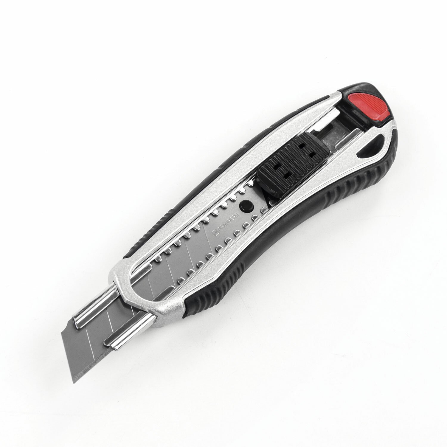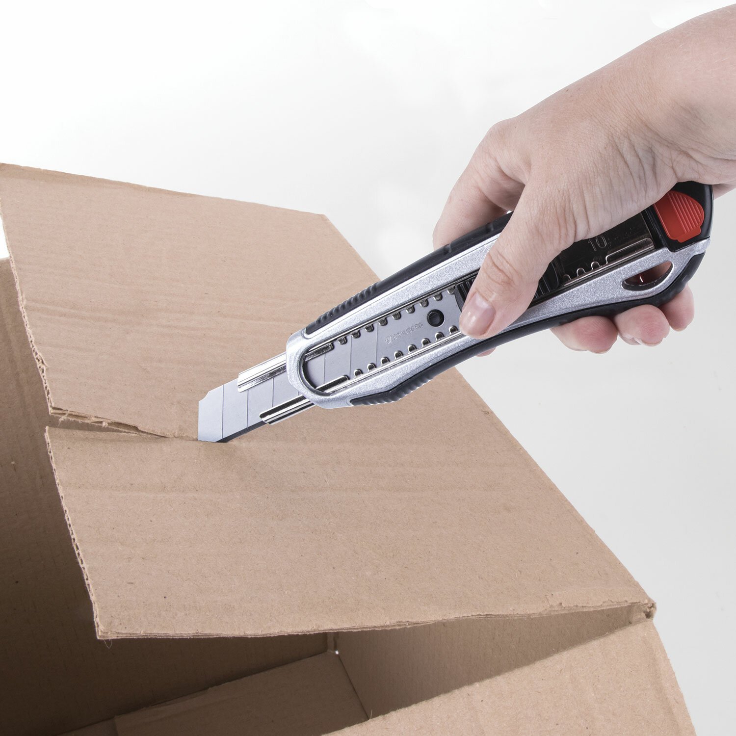 Нож снабжен надежным автоматическим фиксатором. Затупившийся конец лезвия легко удалить, отломив небольшой фрагмент. Металлический корпус серебристого цвета обеспечивает долговечность ножа, а обрезиненная рукоятка предотвращает соскальзывание руки при работе с инструментом. Ширина лезвия - 18 мм. Для удобства хранения имеется отверстие для подвеса. Нож продается в пластиковом блистере с европодвесом.