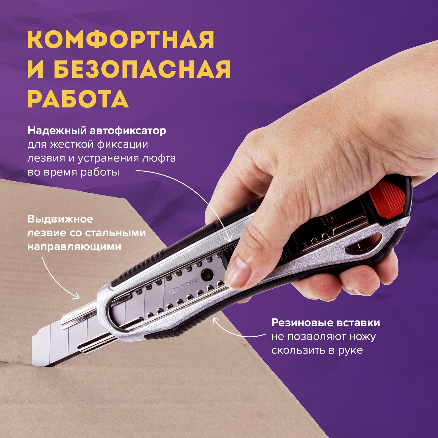 Нож канцелярский мощный 18 мм BRAUBERG "Heavy duty", автофиксатор, резиновые вставки, металл, 237158