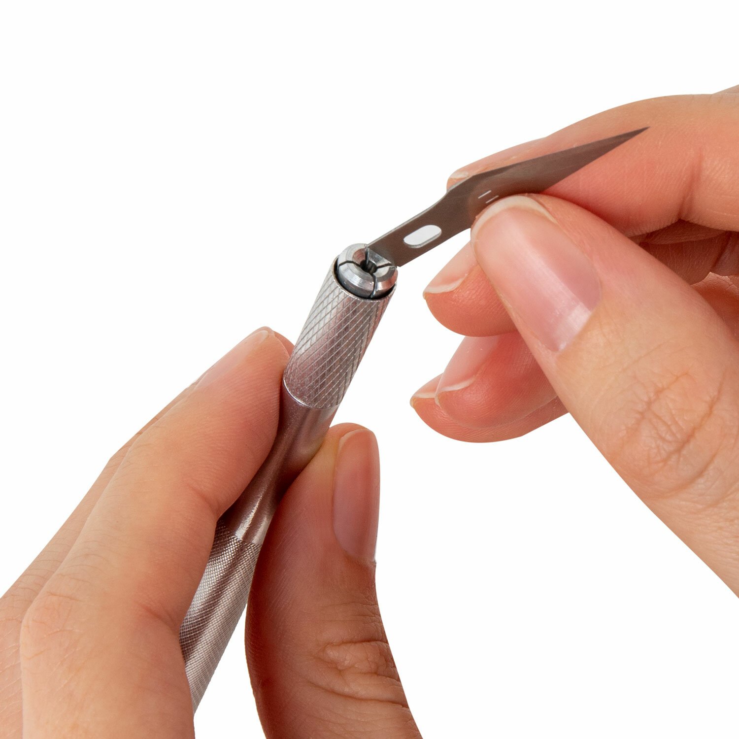 Ультратонкое металлическое лезвие с заостренным кончиком закрывается колпачком по окончании работы. Ширина лезвия составляет 8 мм. Поставляется в блистере с европодвесом. 5 запасных лезвий в комплекте.