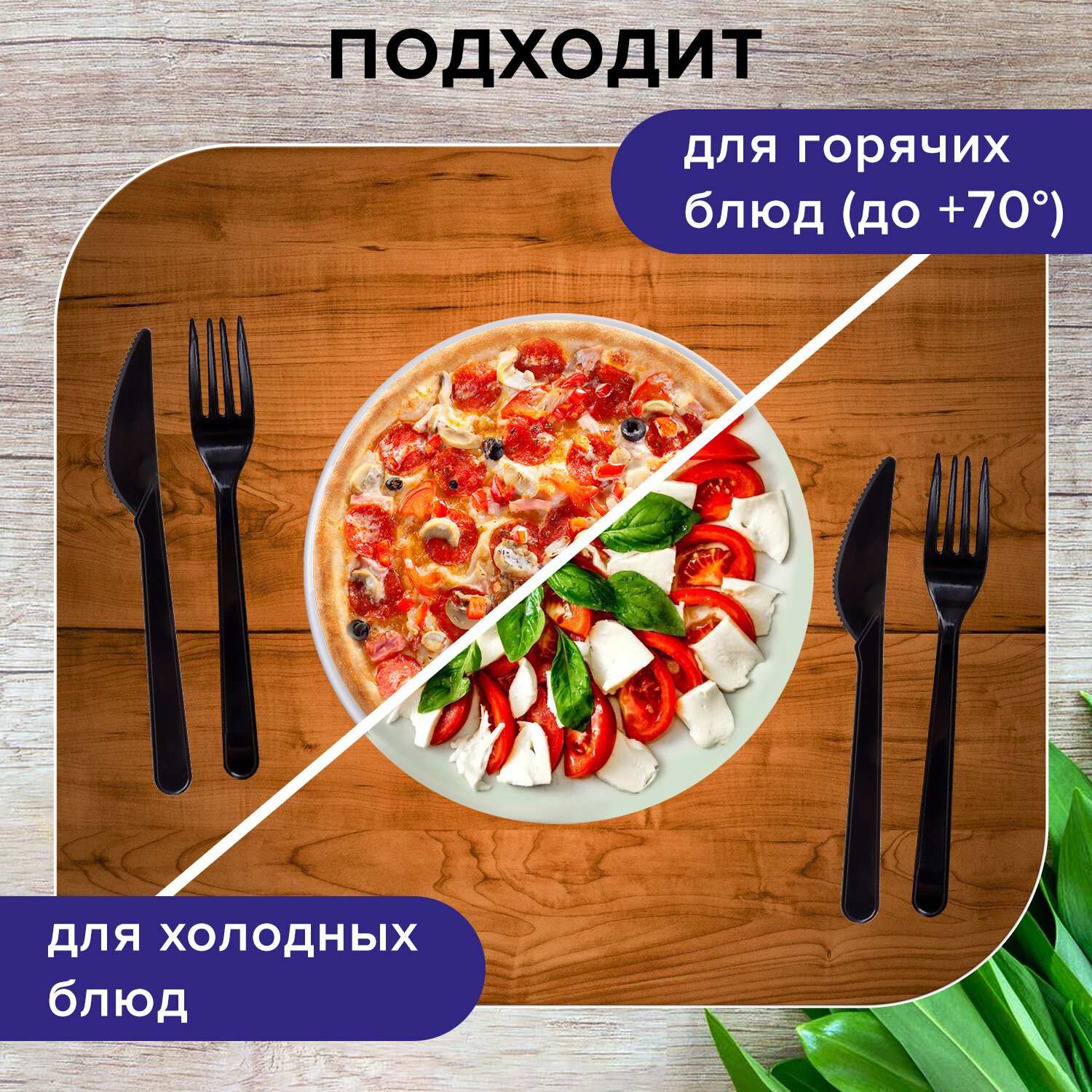 Приборы изготовлены из высококачественного пищевого полистирола черного цвета, поэтому они легкие и безопасные в использовании. Подойдут как для холодных, так и для горячих (до +70°С) блюд. Длина — 180 мм. В упаковке 50 штук.