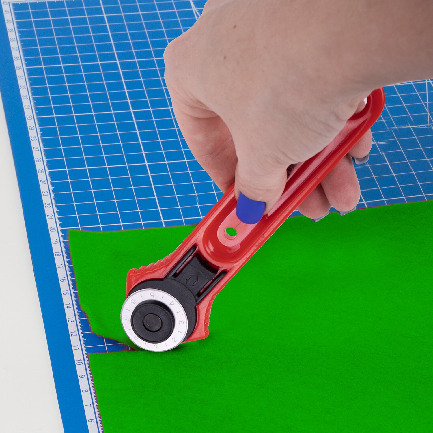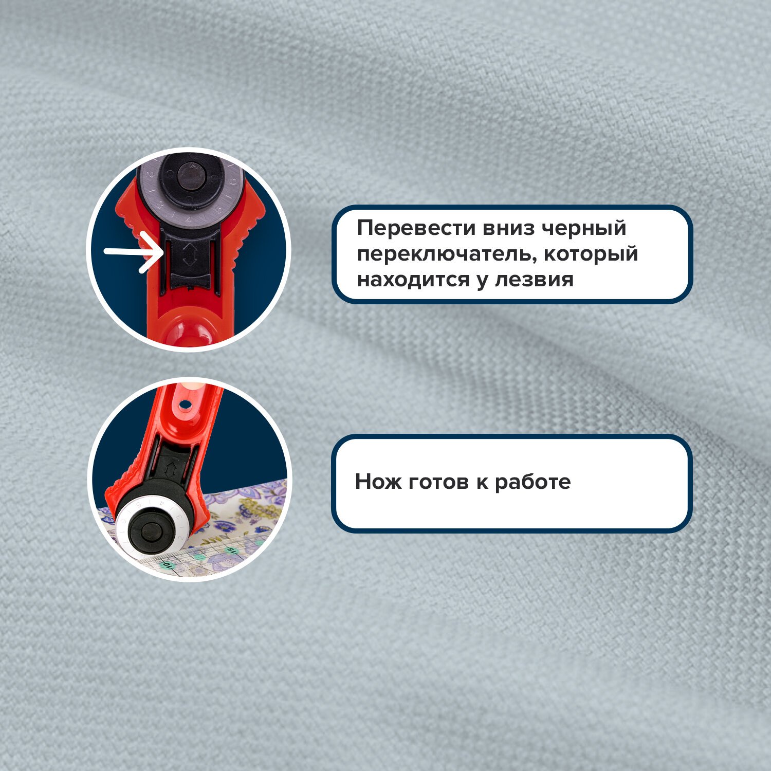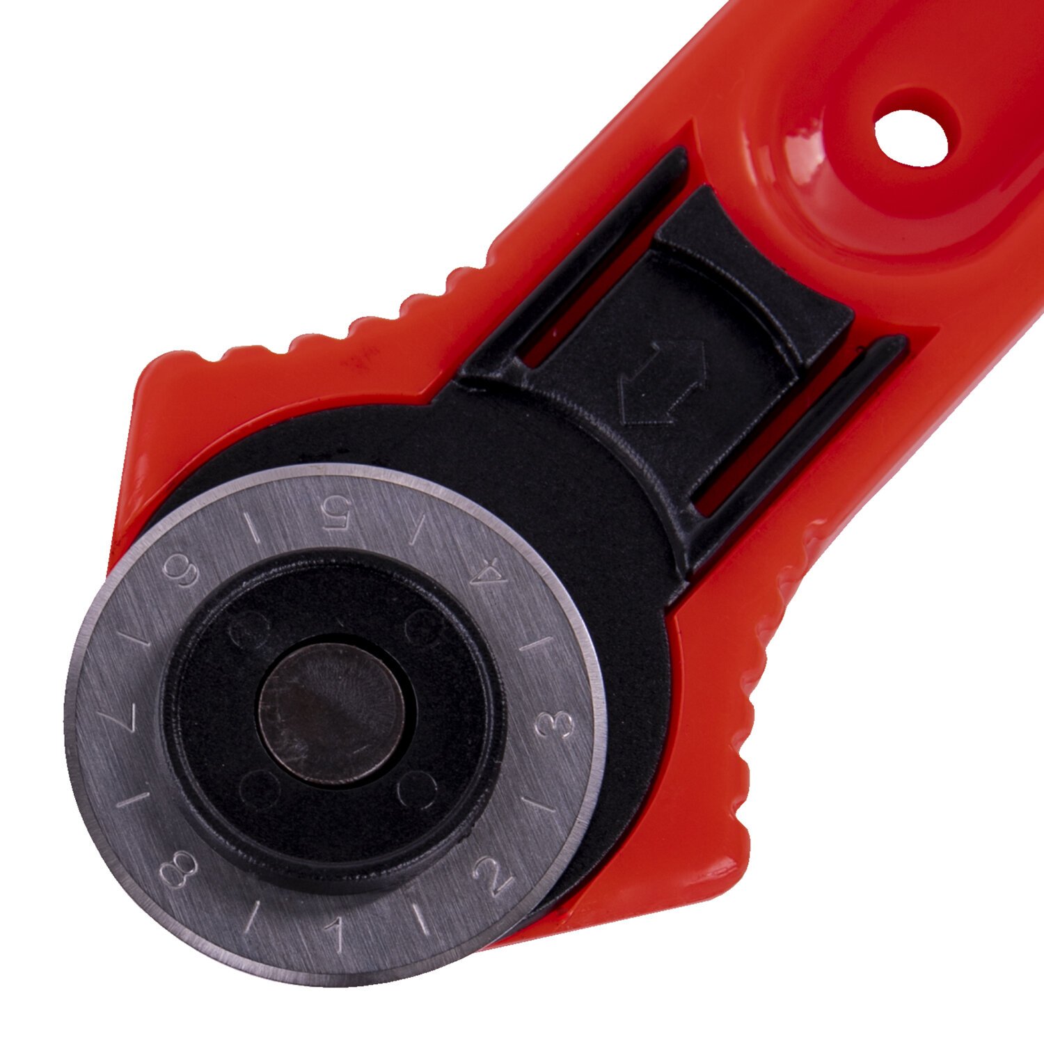 Острое вращающееся лезвие диаметром 28 мм обеспечивает точный раскрой, а регулировочный винт изменяет степень вращения лезвия: от свободного вращения до полной фиксации.