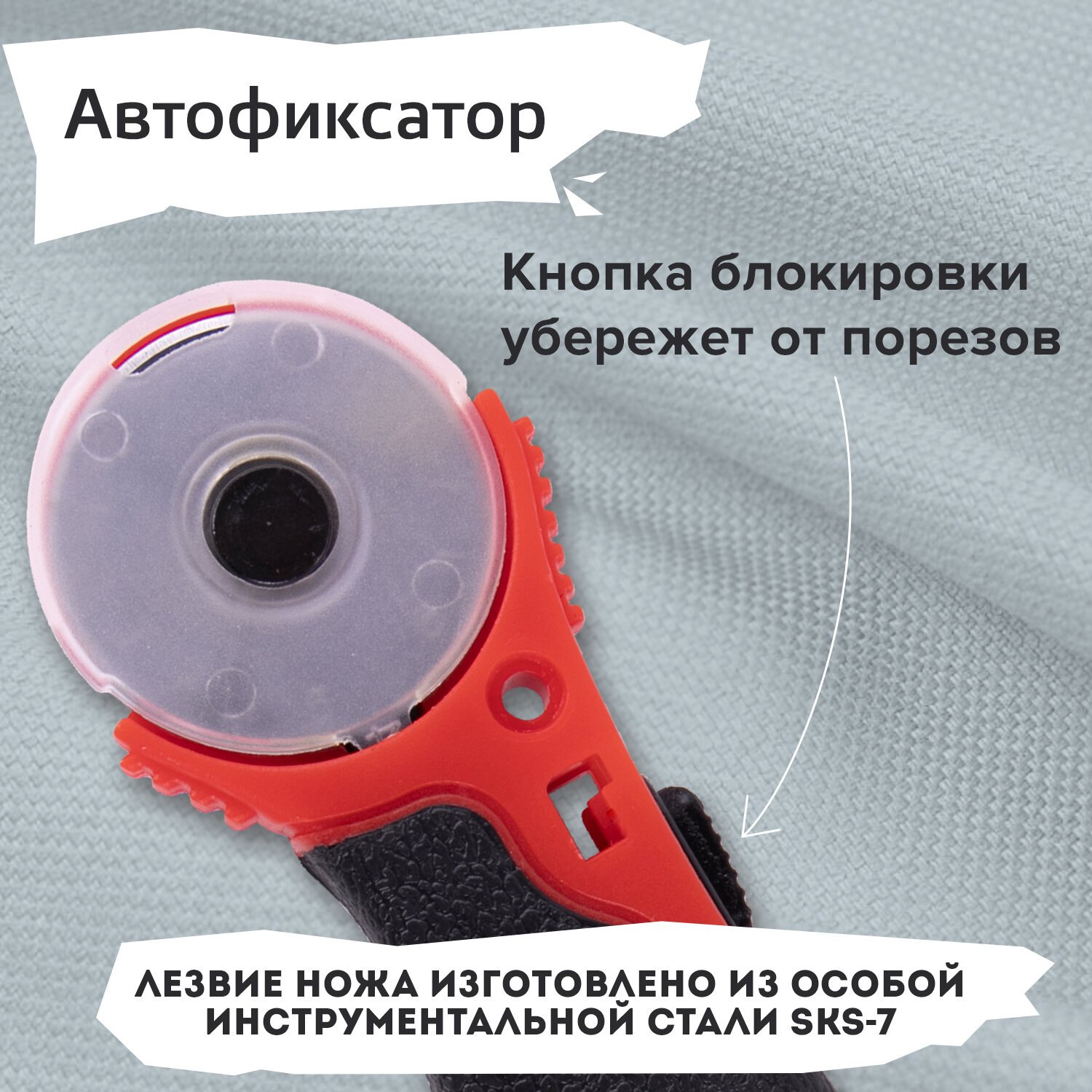 Острое вращающееся лезвие диаметром 28 мм обеспечивает точный раскрой, а регулировочный винт изменяет степень вращения лезвия: от свободного вращения до полной фиксации.