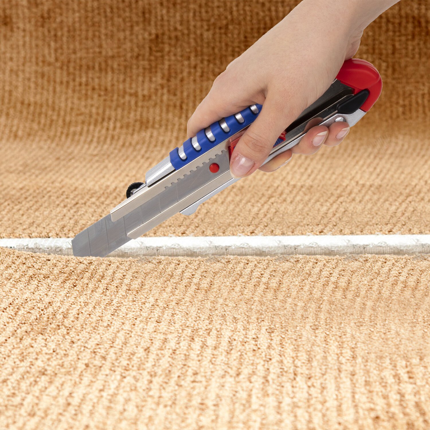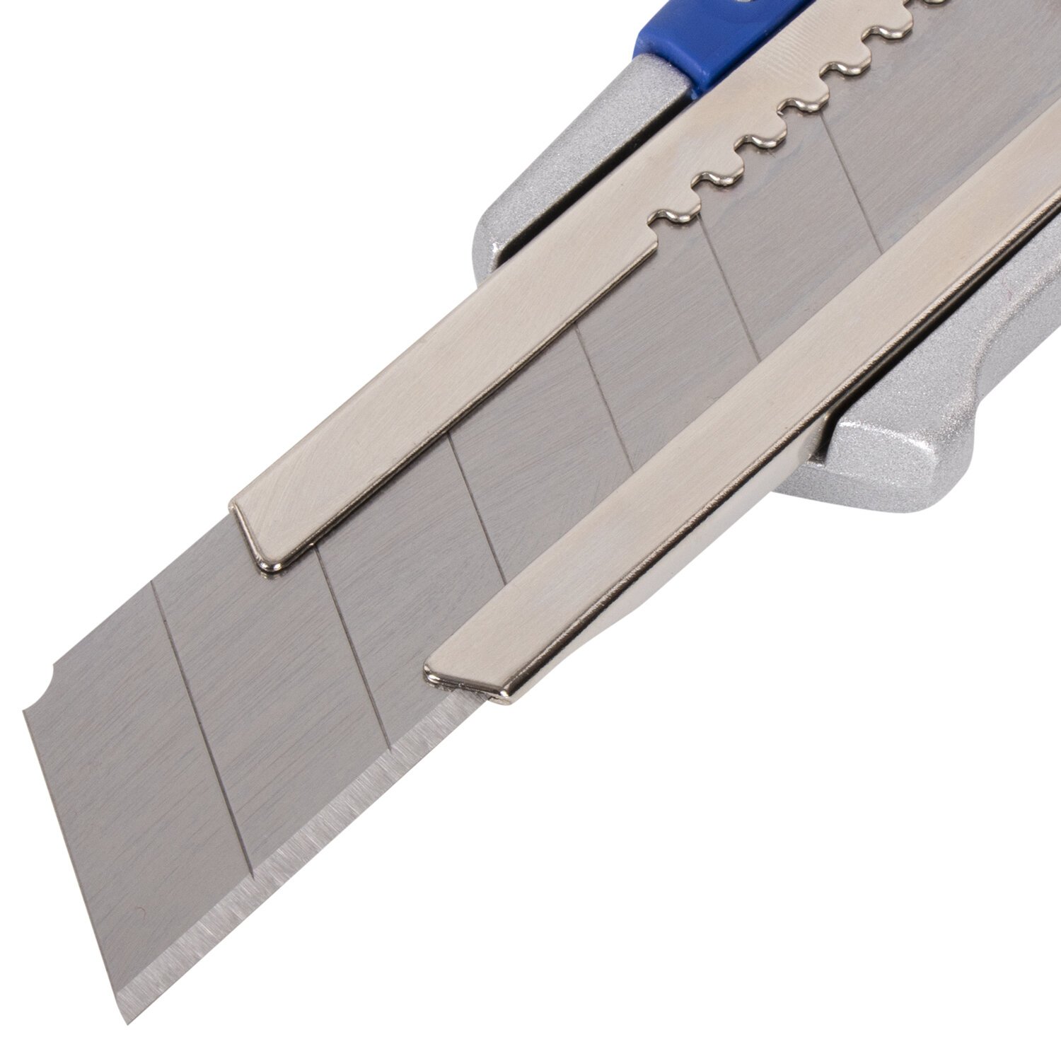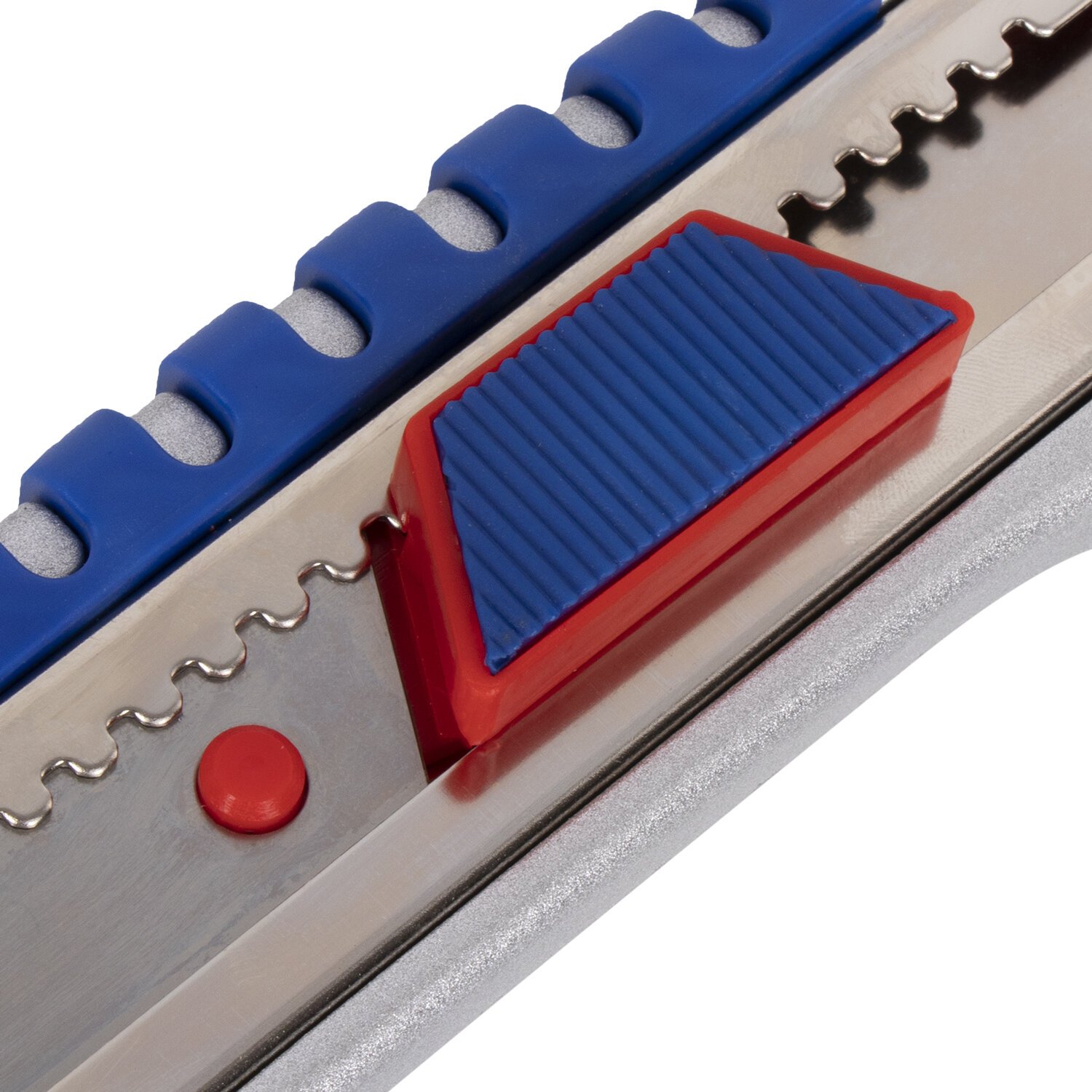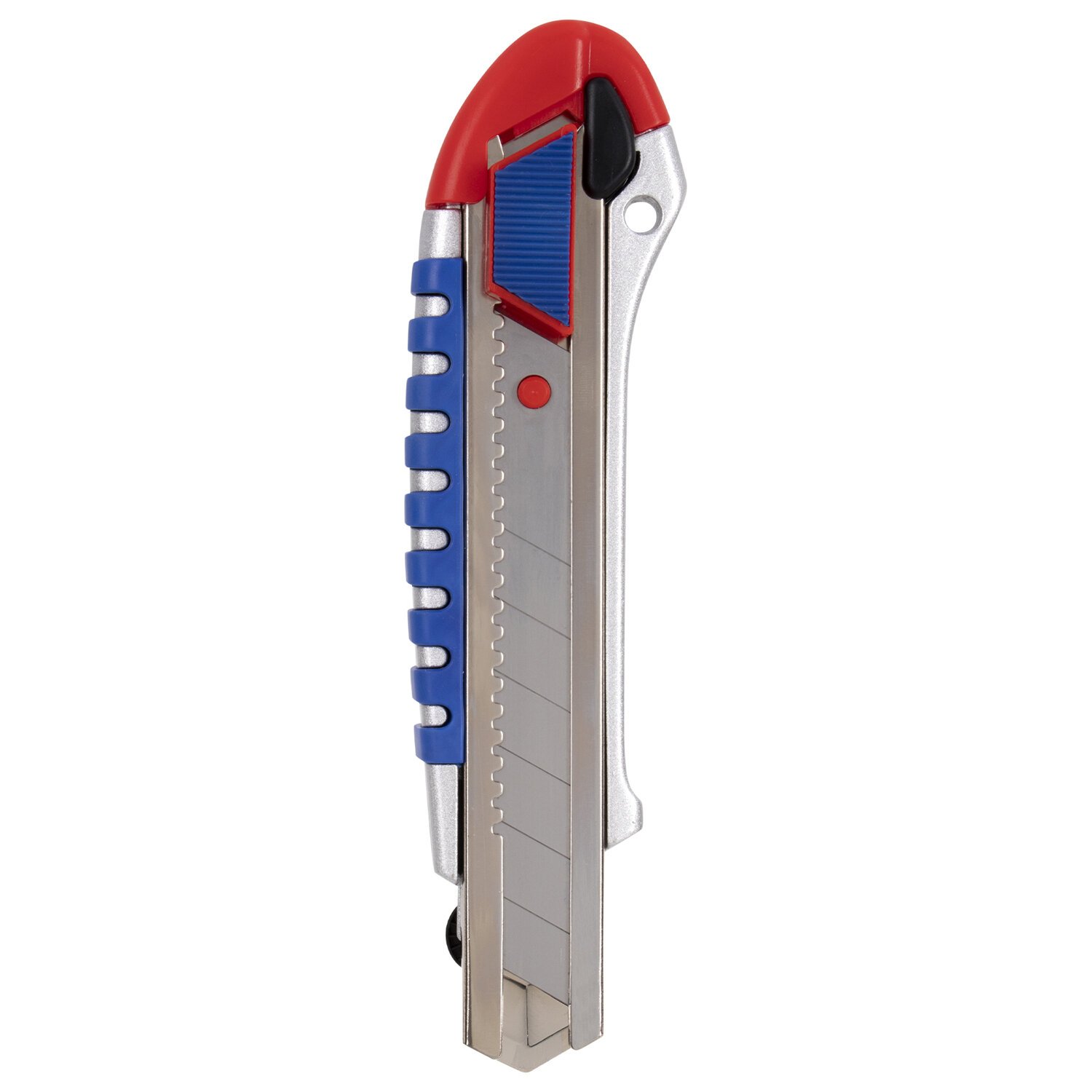 Металлический корпус надежно фиксирует стальное острое лезвие шириной 25 мм. Изделие имеет эргономичное оформление: рукоятка снабжена резиновой антискользящей накладкой, серебристый цвет корпуса гармонирует с дополнительными цветами - синим и красным, а специальное отверстие дает возможность вешать нож на специальный крепеж. Конструкция упакована в блистер.