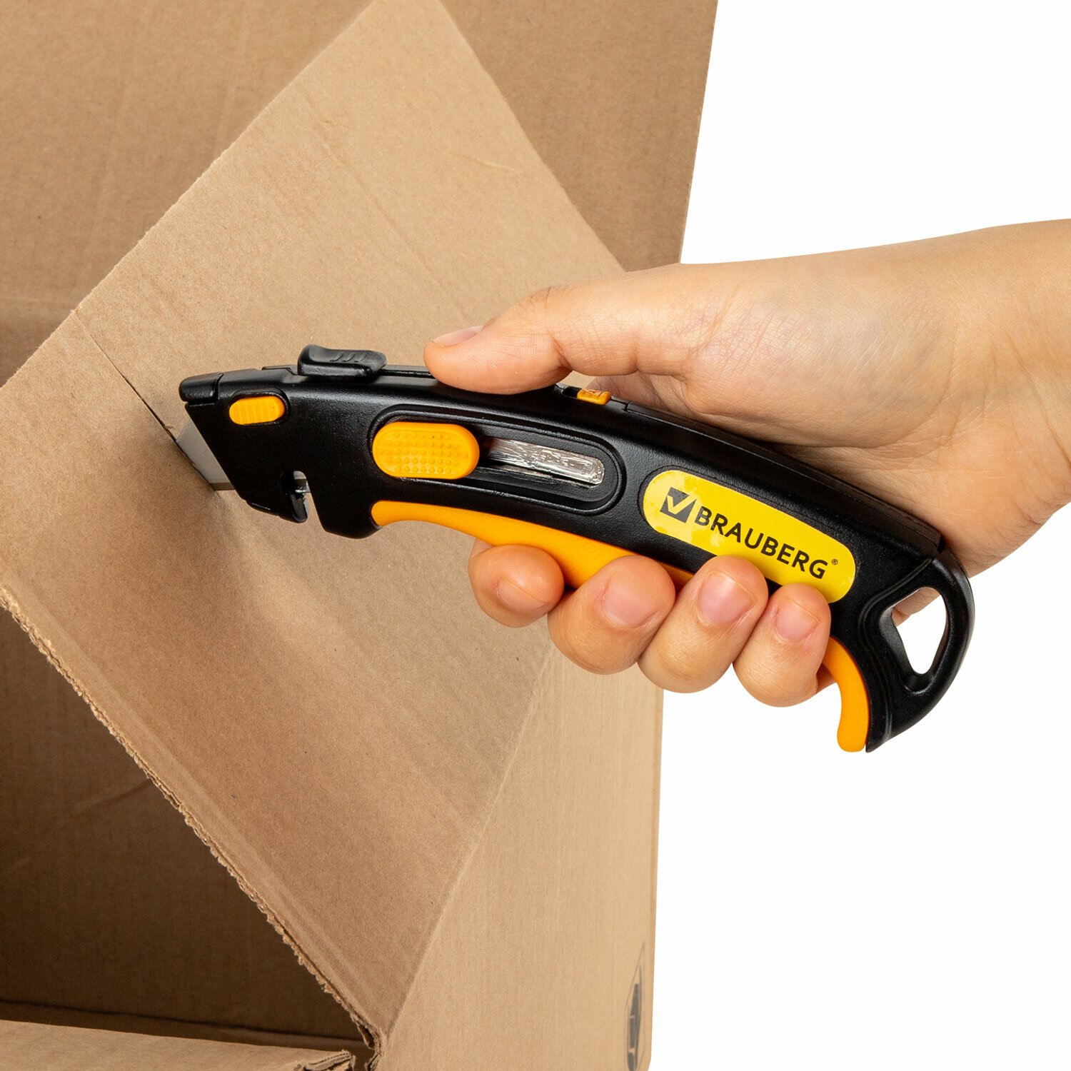 Универсальный мощный нож с автофикстором BRAUBERG – инструмент, который поможет при резке бумаги, пластика, картона и прочих плотных и вязких материалов: линолеума, гипсокартона, ковролина.