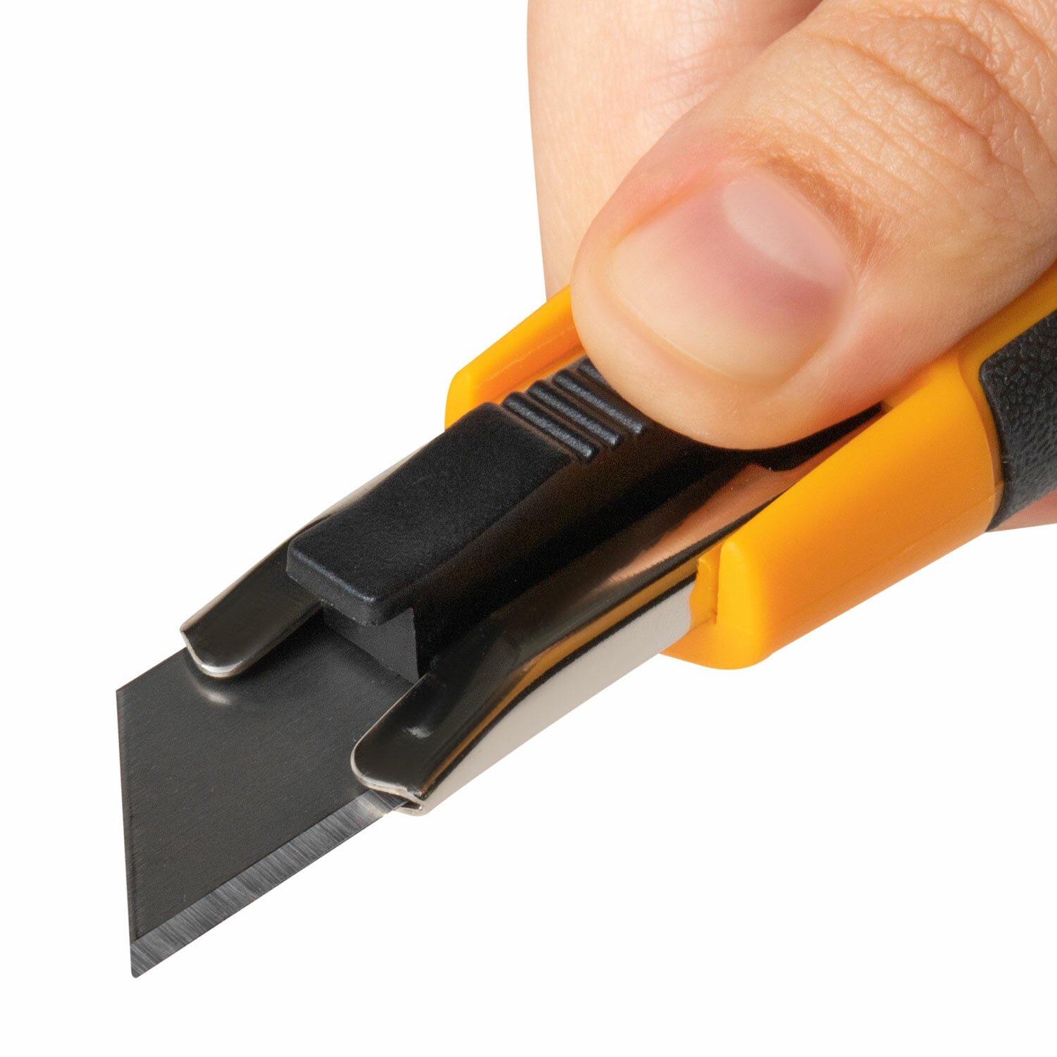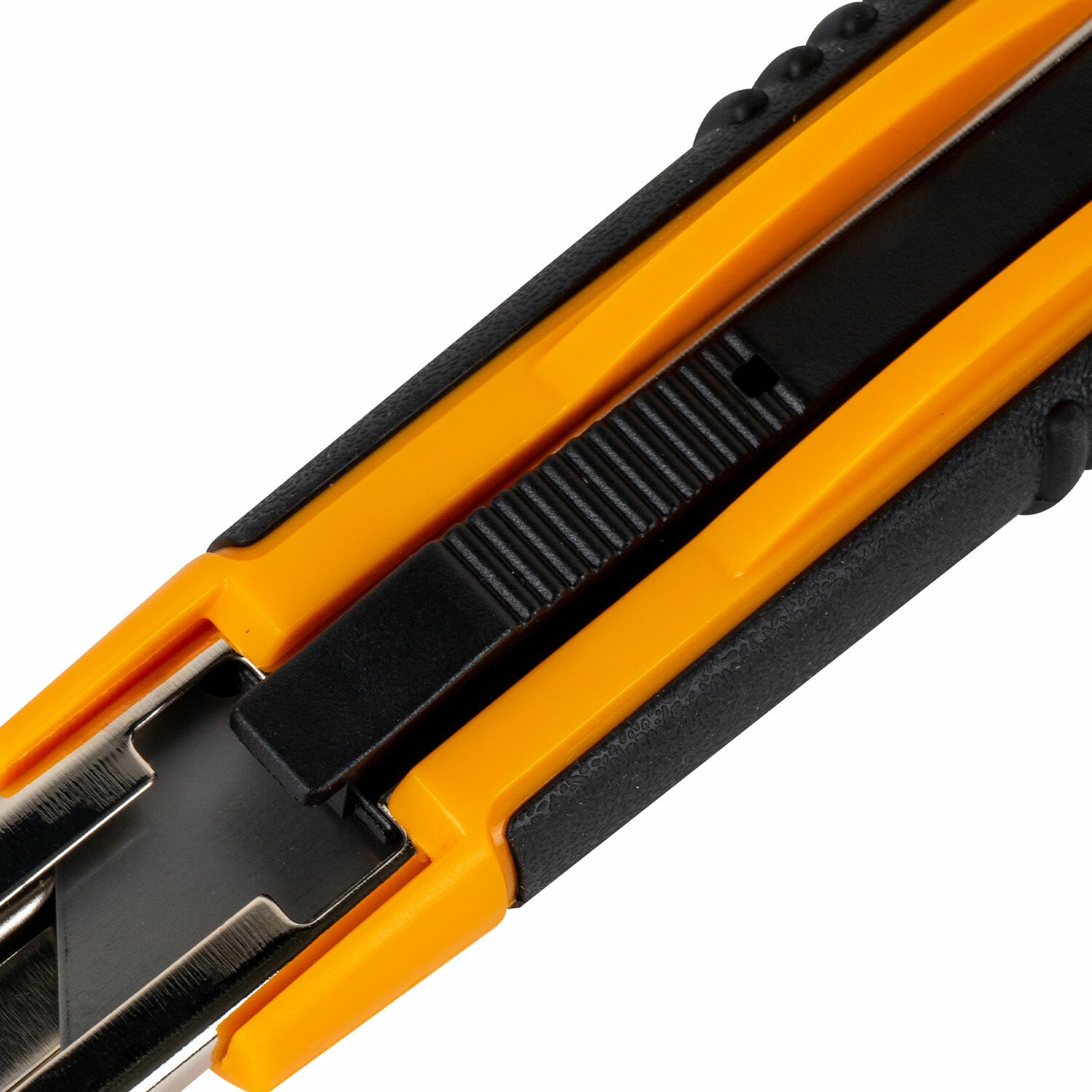 Трапециевидное лезвие шириной 18 мм позволяет использовать его для резки более плотных и тонких материалов. Нож снабжен возвратной пружиной и антискользящими вставками. Может использоваться при отделочных работах или в домашнем хозяйстве при разрезании толстого и плотного гипсокартона или вязких ковровых покрытий. Затупившееся лезвие можно поменять, тем самым вернув ножу былую остроту.