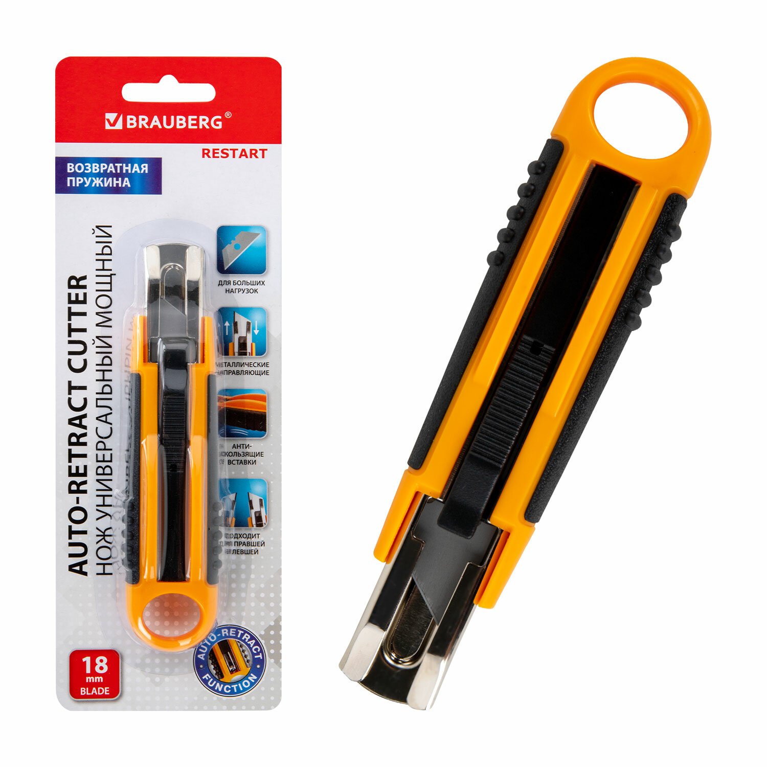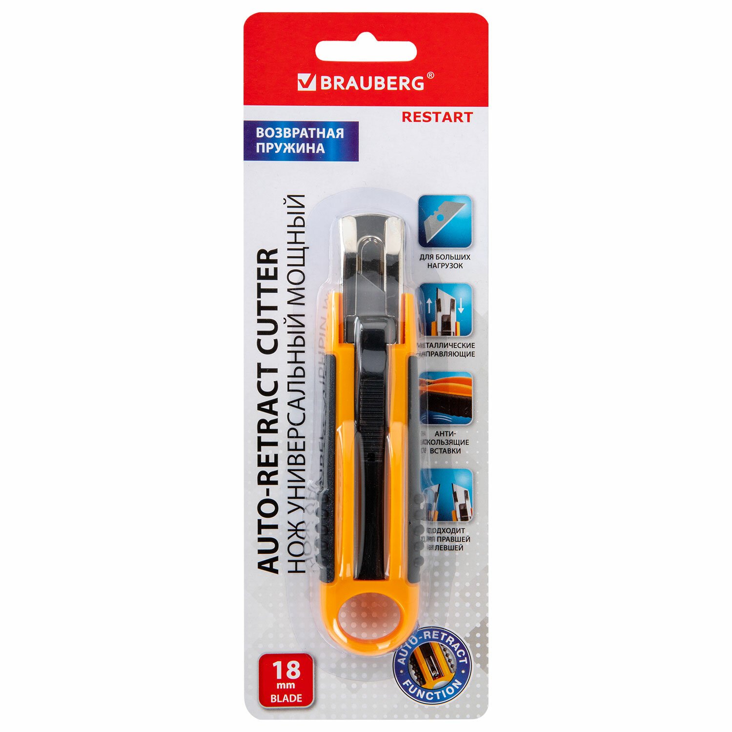 Нож универсальный мощный с возвратной пружиной BRAUBERG reSTART, трапециевидное лезвие, 238730