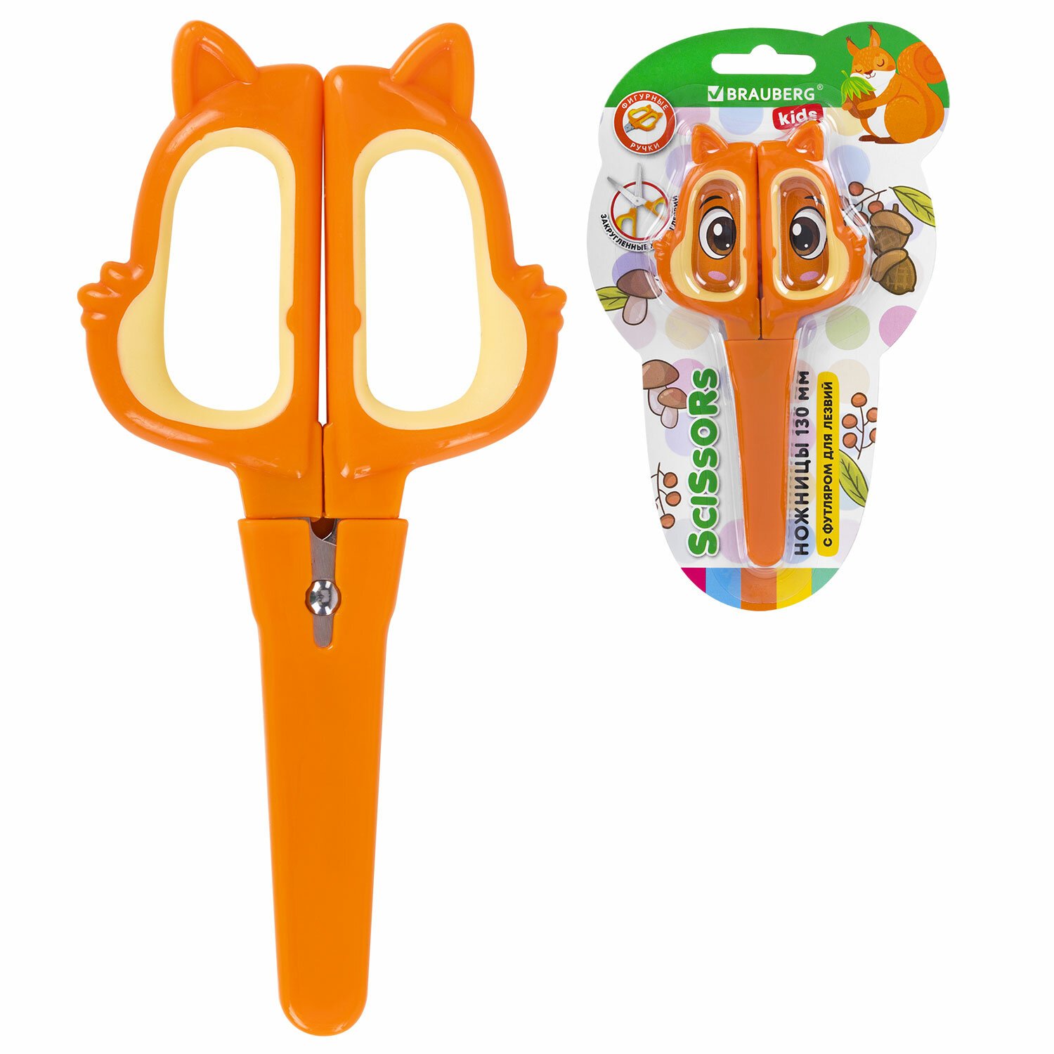 Ножницы 130 мм, фигурные рукоятки с резиновыми вставками "Белочка", с чехлом, BRAUBERG KIDS, 238353