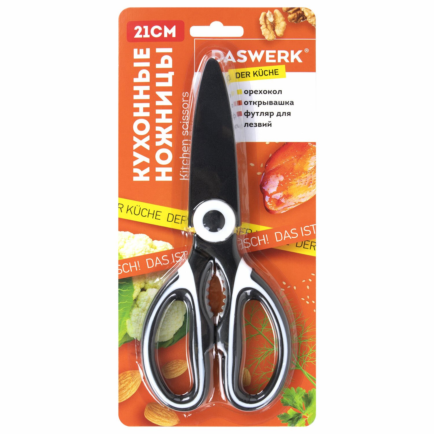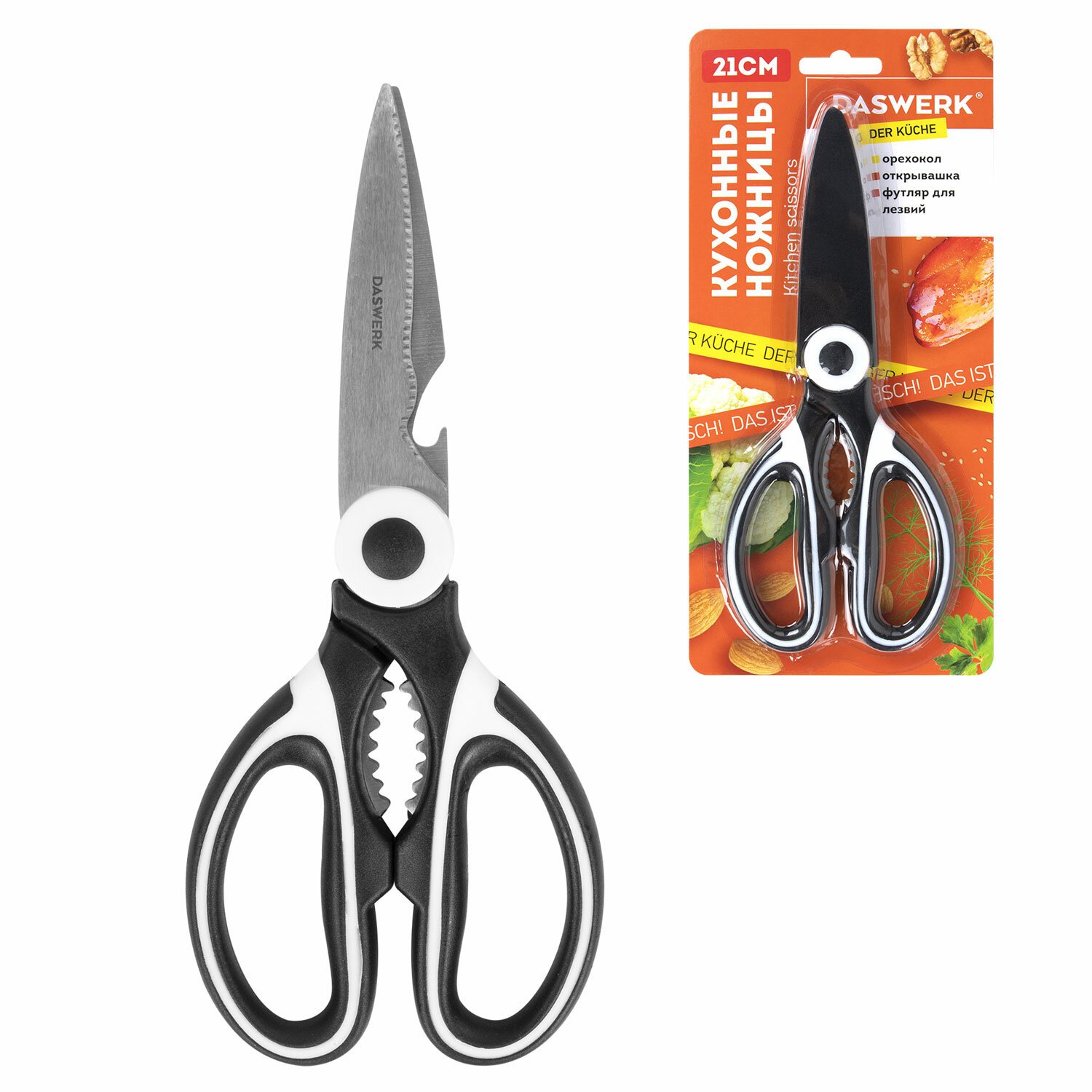 Ножницы кухонные DASWERK, 210 мм, с орехоколом, открывашкой, футляром для лезвий, 608904