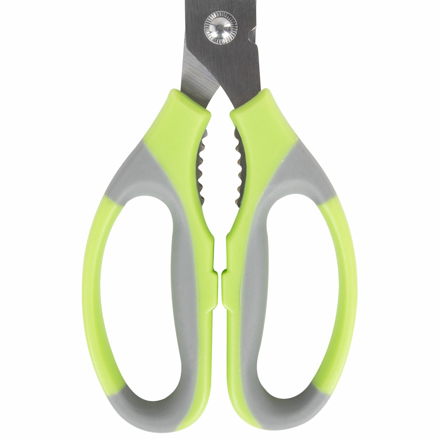 Прочные лезвия толщиной 2,5 мм из нержавеющей пищевой стали, соединены усиленной осью, что исключает зазор и люфт, обеспечивая точность реза. Изделие снабжено эргономичными пластиковыми ручками с противоскользящими вставками, обеспечивающими надежный захват инструмента при работе и препятствующими выскальзыванию его из рук. Легко моется, не впитывает посторонние запахи, можно мыть в посудомоечной машине. Общая длина – 210 мм. Оснащены открывашкой для бутылок, механизмом для колки орехов и серрейторной заточкой для резки ткани и веревок.