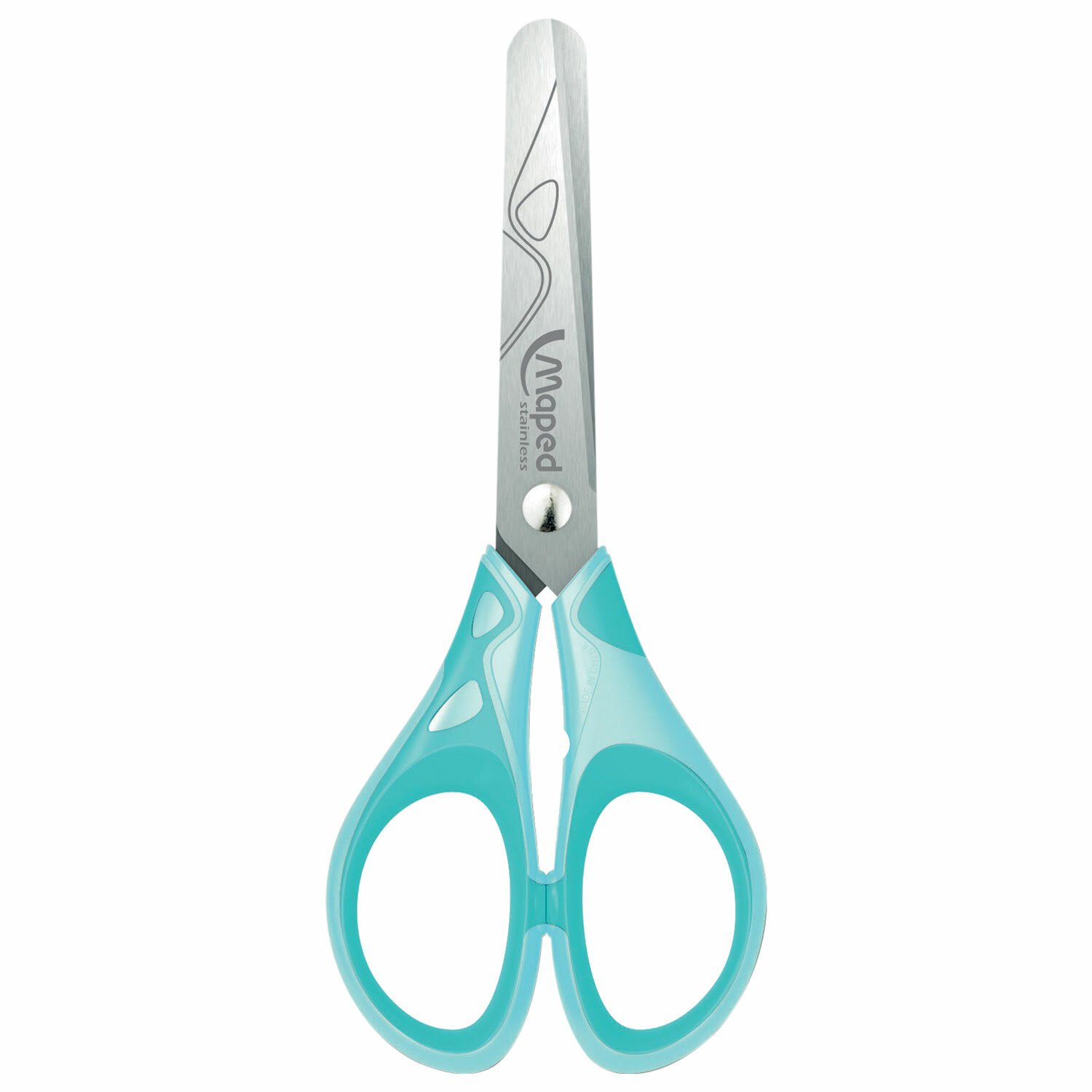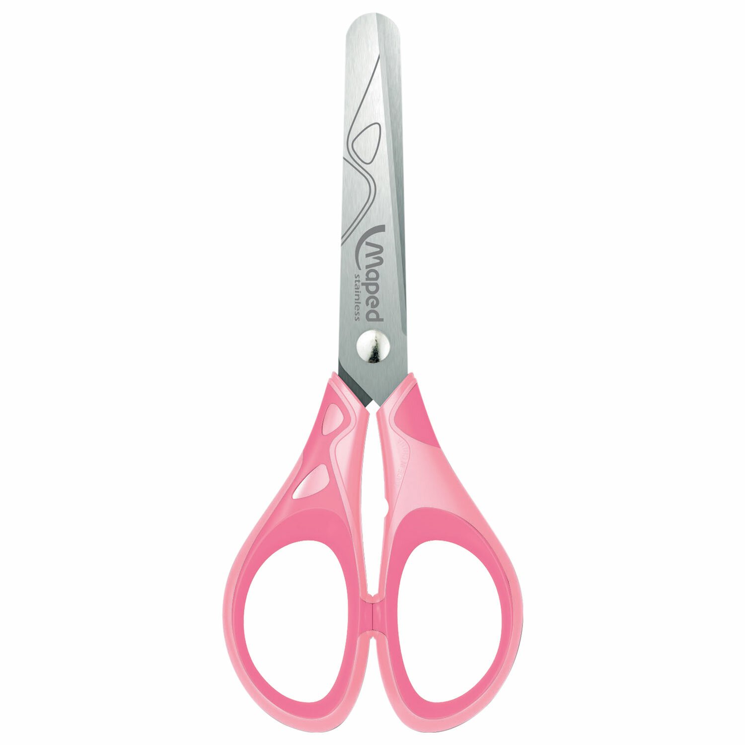 Канцелярские ножницы MAPED для использования в школе и дома. Подходят для детей от 4 лет. Привлекательный дизайн с яркими ручками и узором на лезвии. Цвет ручек – сине-голубой, сиренево-малиновый, красно-черный.