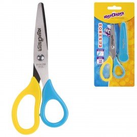 Ножницы ЮНЛАНДИЯ, 135 мм, с футляром для лезвий, желто-голубые, блистер, 237110