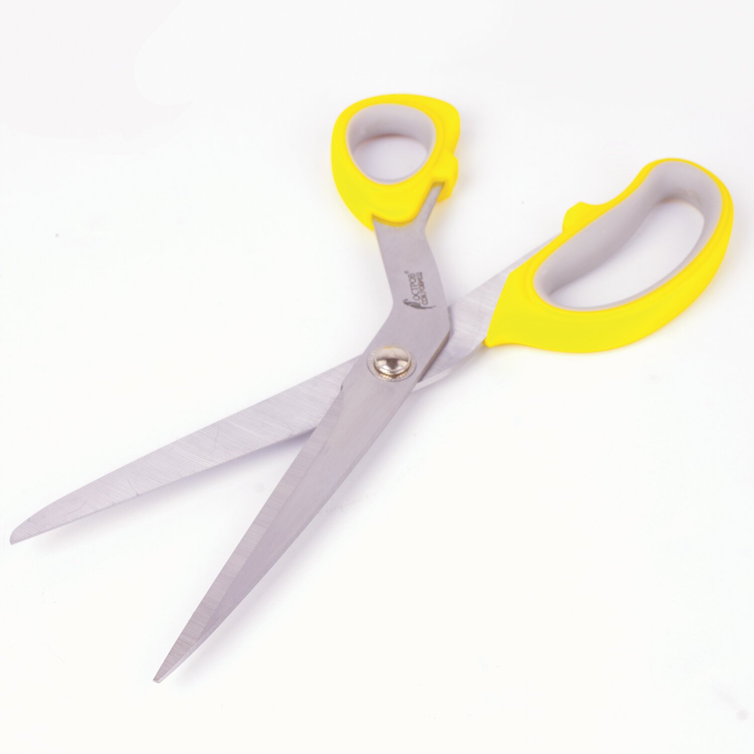 Эргономичные пластиковые ручки с резиновыми серыми вставками удобны в использовании. Лезвия выполнены из нержавеющей стали. Общая длина ножниц составляет 230 мм, позволяя выкраивать мелкие детали.