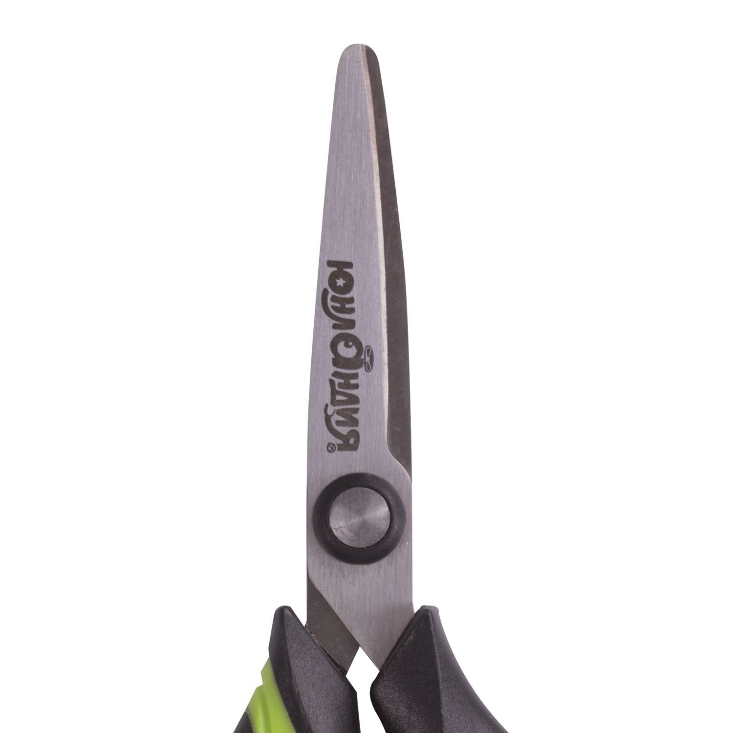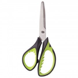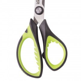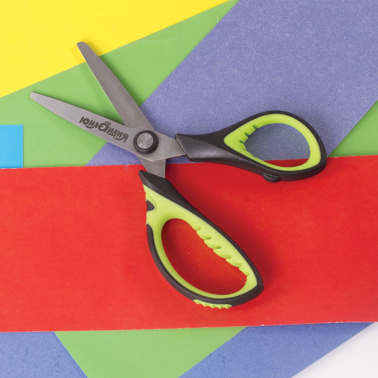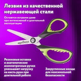 Ножницы ЮНЛАНДИЯ с эргономичными ручками помогают уменьшить нагрузку на руку ребенка при интенсивной и продолжительной работе, а ребристые резиновые вставки яркого салатового цвета не позволяют пальцам скользить во время использования.