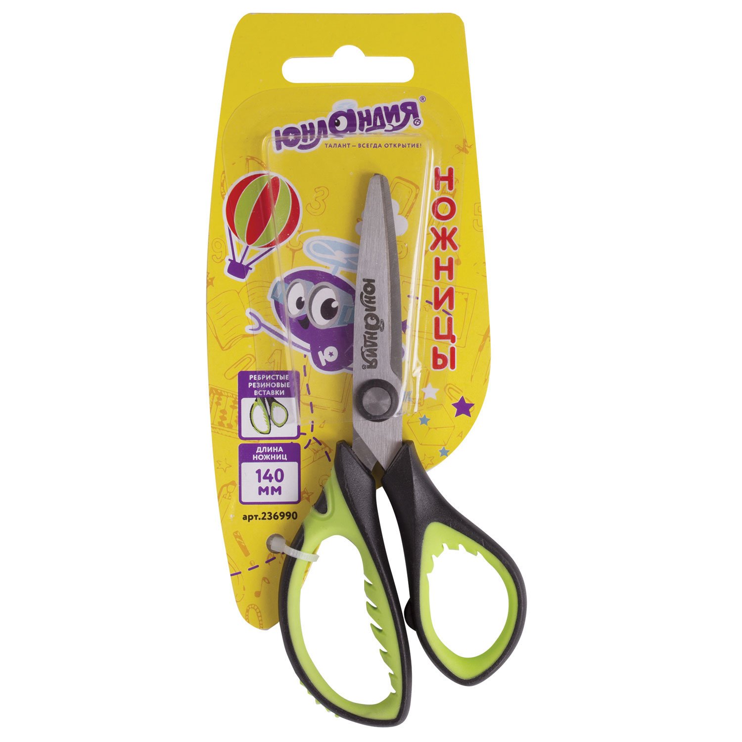 Ножницы ЮНЛАНДИЯ "BASIC", 140 мм, ребристые резиновые вставки, черно-салатовые, европодвес, 236990