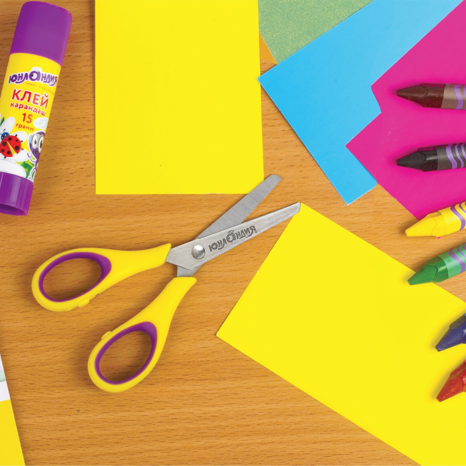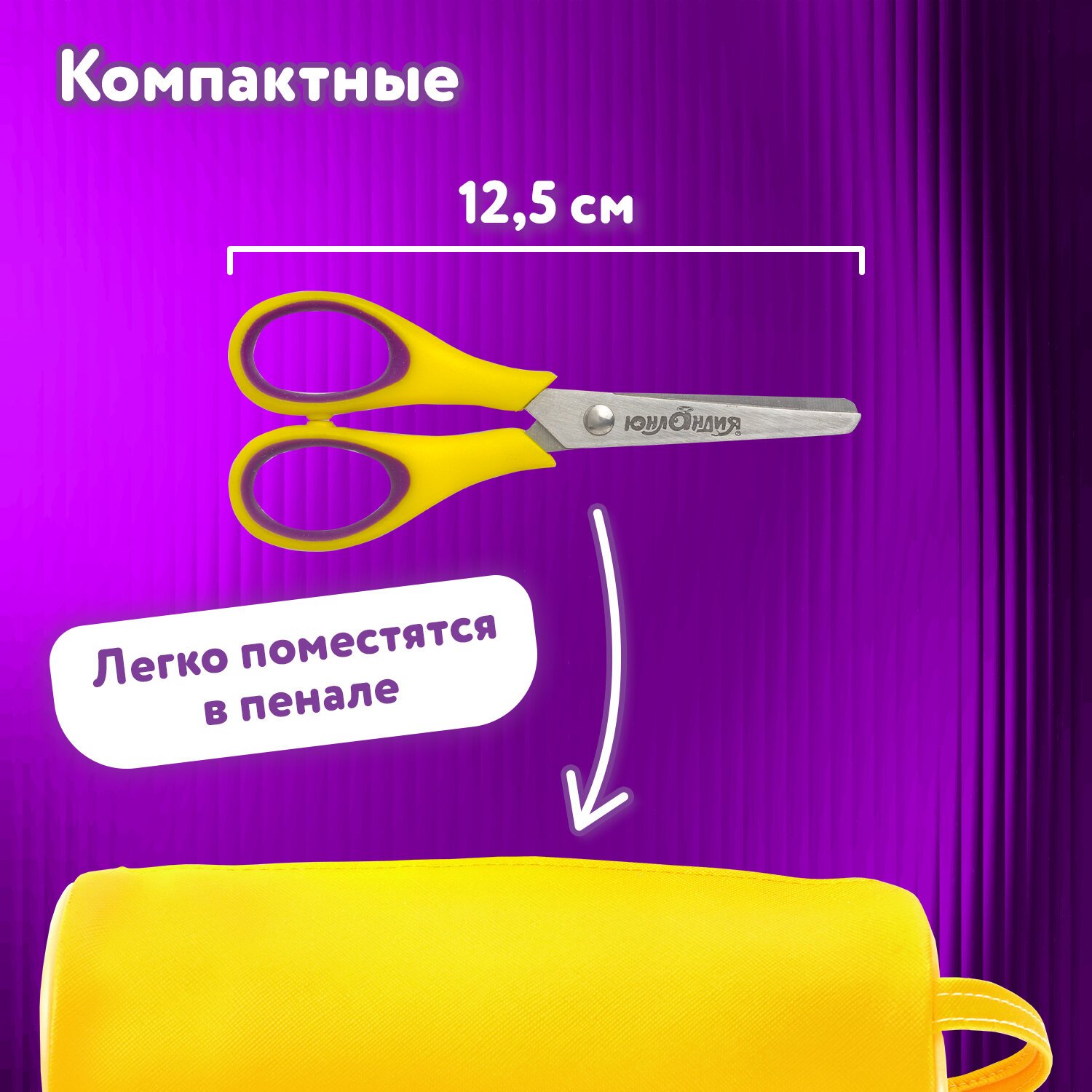 Ножницы ЮНЛАНДИЯ с симметричными ручками имеют удобные резиновые вставки желто-фиолетового цвета, которые не позволяют пальцам скользить во время использования.