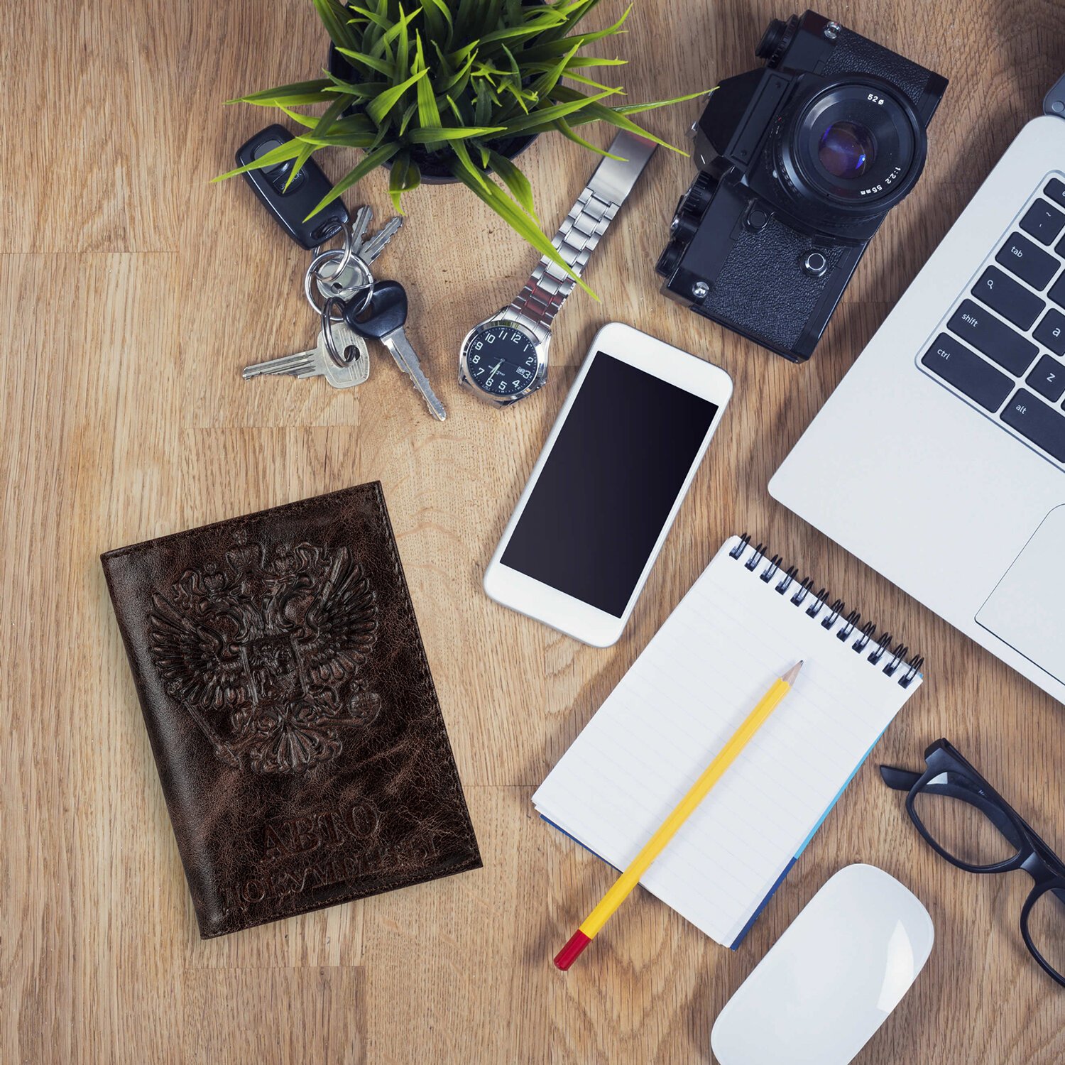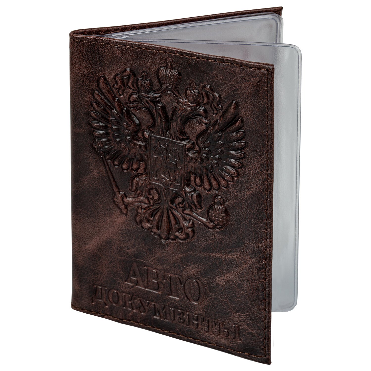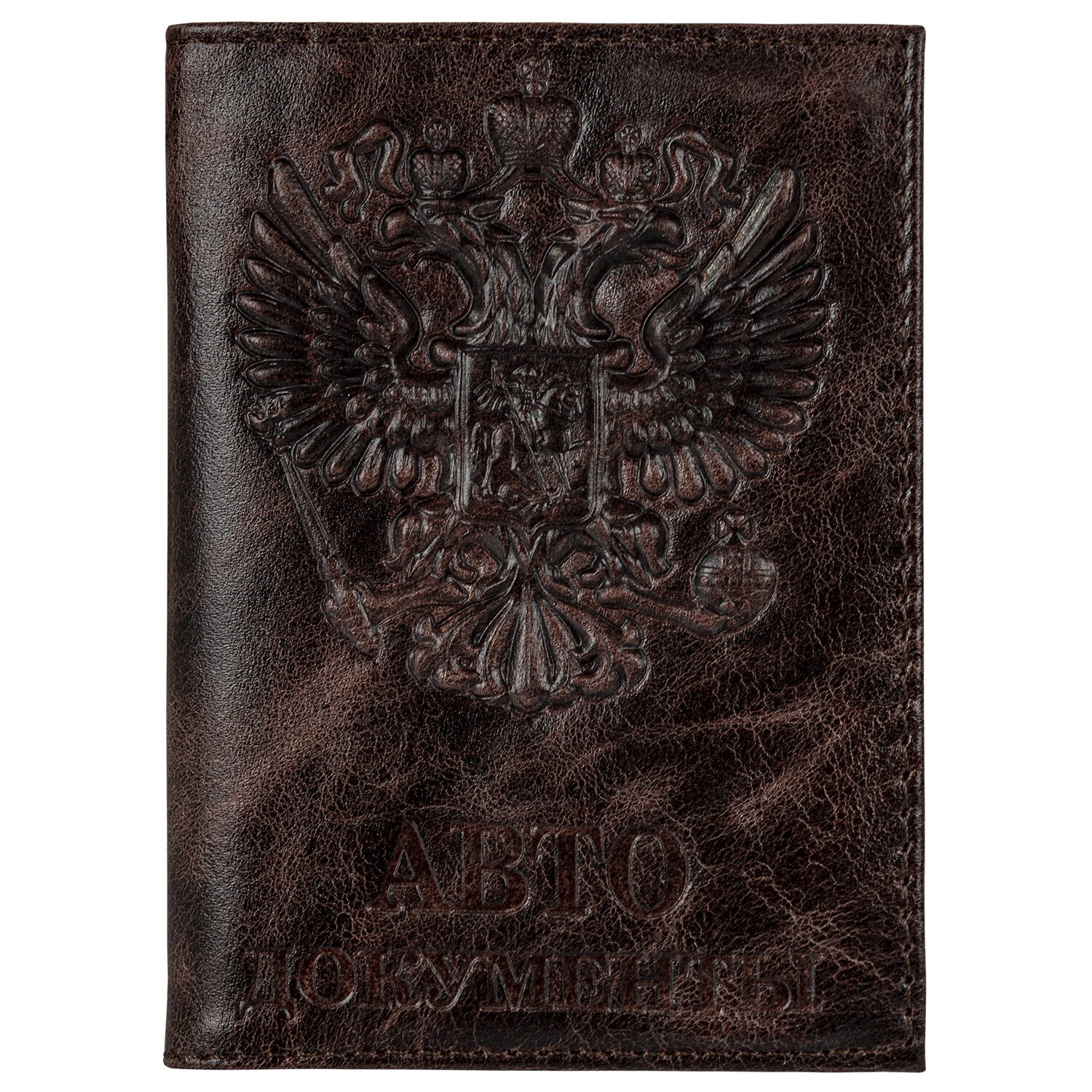 Обложка для автодокументов натуральная кожа пулап, 3D герб + тиснение, темно-коричневая, BRAUBERG, 238195