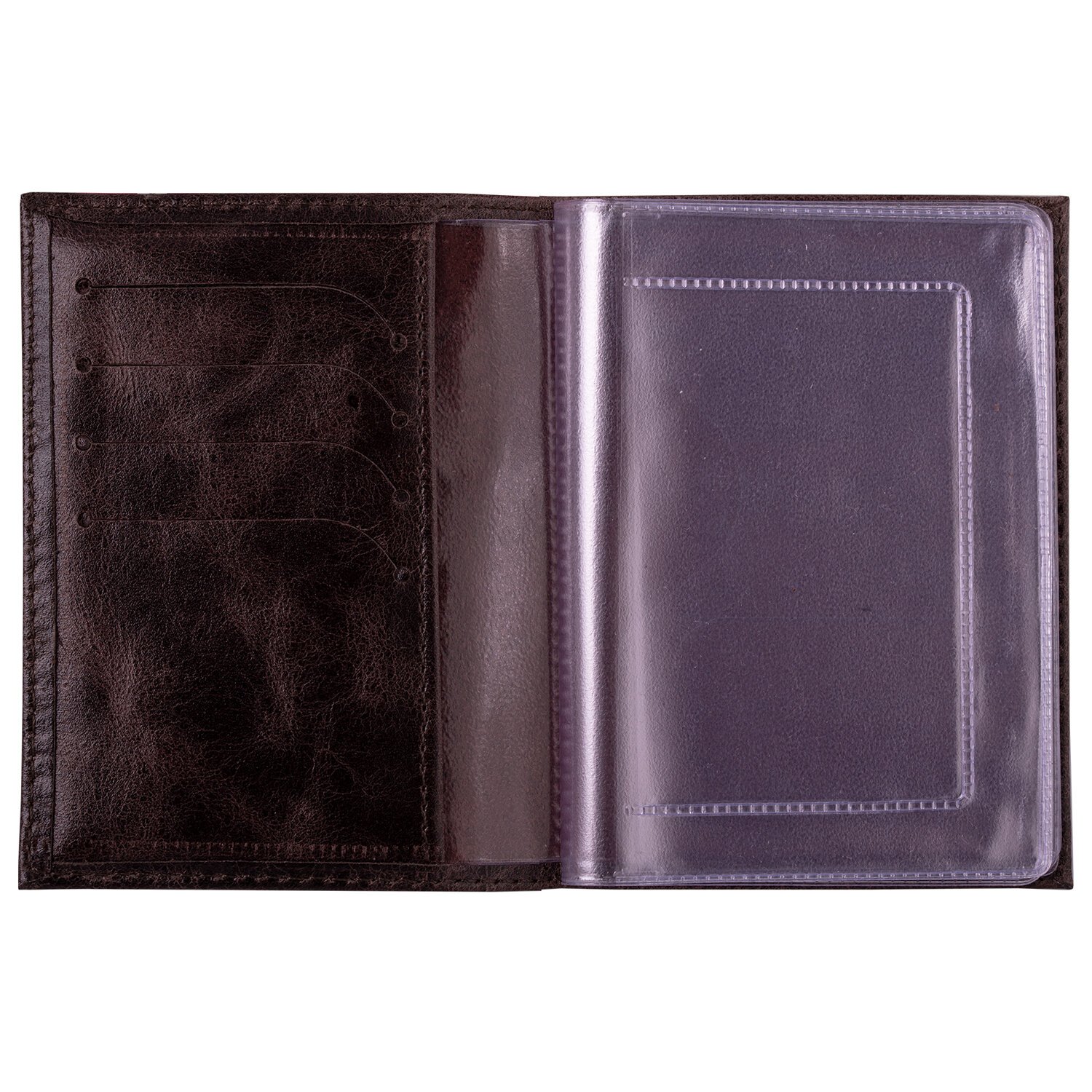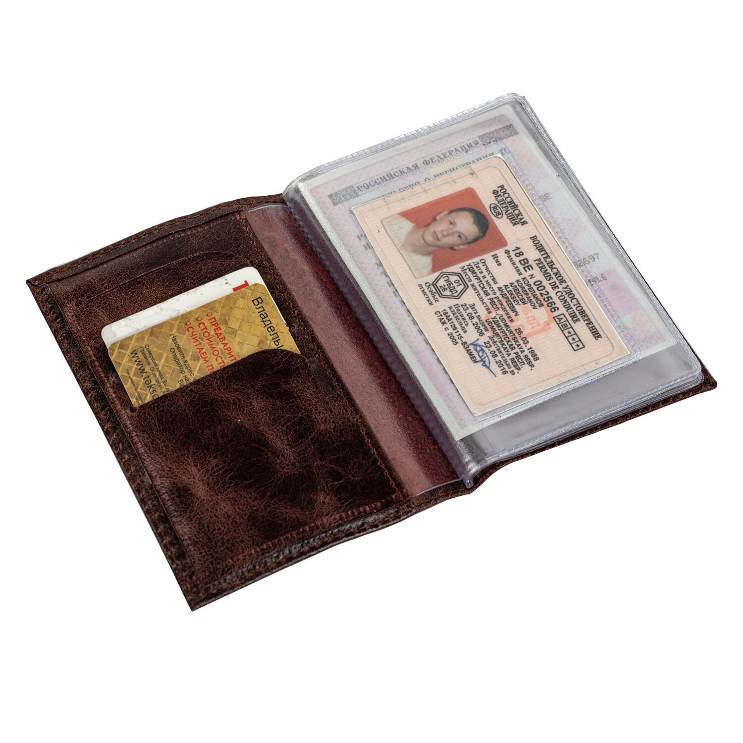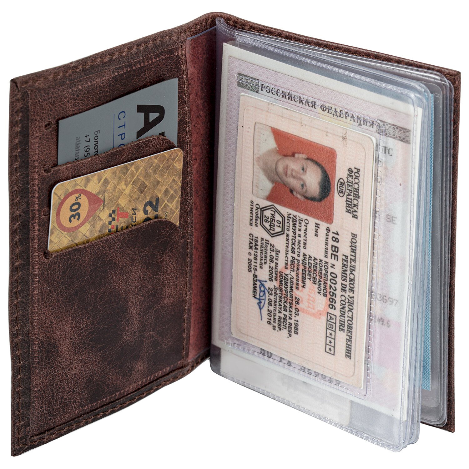 Модель выполнена из натуральной кожи в тёмно-коричневом цвете с 3D тиснением государственной символикой "Герб" и "АВТОДОКУМЕНТЫ". Вмещает в себя 6 пластиковых карманов: 1 файл для водительского удостоверения (60х89 мм), 4 файла размером 80х120 мм (подходят для СТС) и 1 файл для страхового полиса или доверенности формата А5 (150х216 мм) - документ формата А5 подразумевает его складывание пополам лицевой стороной наружу. Дополнительно присутствует кожаный карман с отделениями для пластиковых карт. Компактный размер обложки (95х130 мм) позволяет всегда носить с собой нужные автодокументы.
