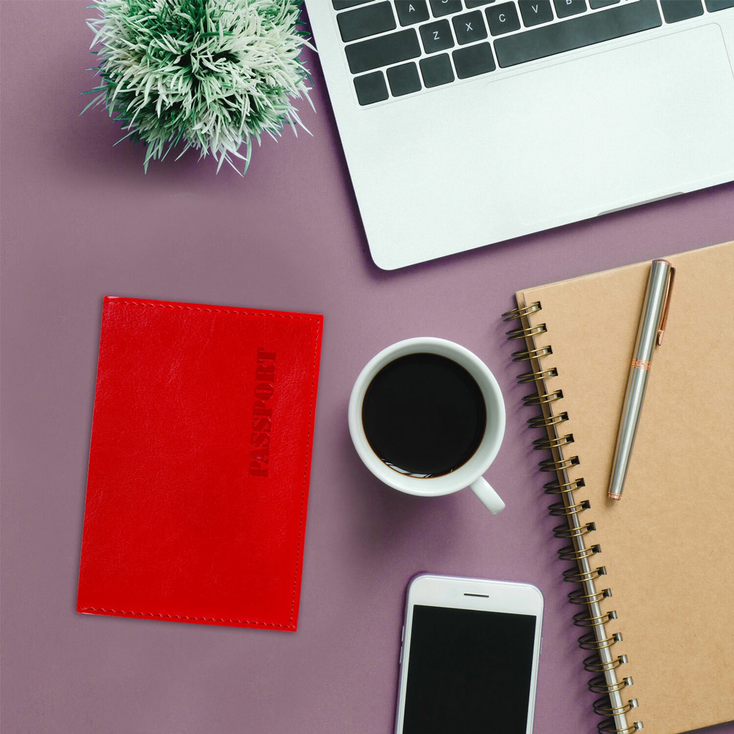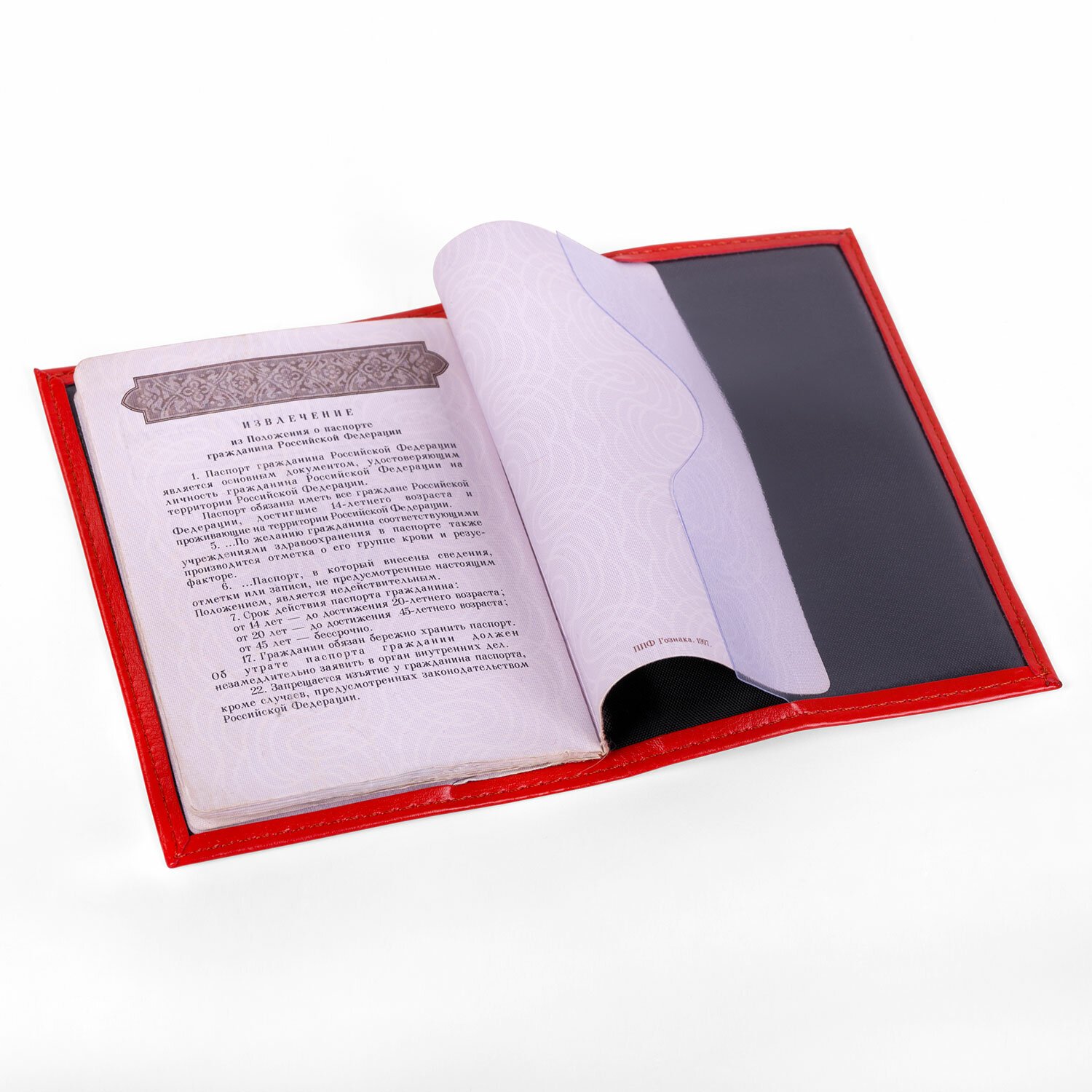 Модель выполнена из экокожи красного цвета и украшена тисненой надписью "PASSPORT". Имеет простроченные края и мягкую изолоновую вставку. На внутреннем развороте расположены два кармана из прозрачного пластика. Благодаря компактным размерам обложки (97х138 мм) паспорт удобно всегда носить с собой.