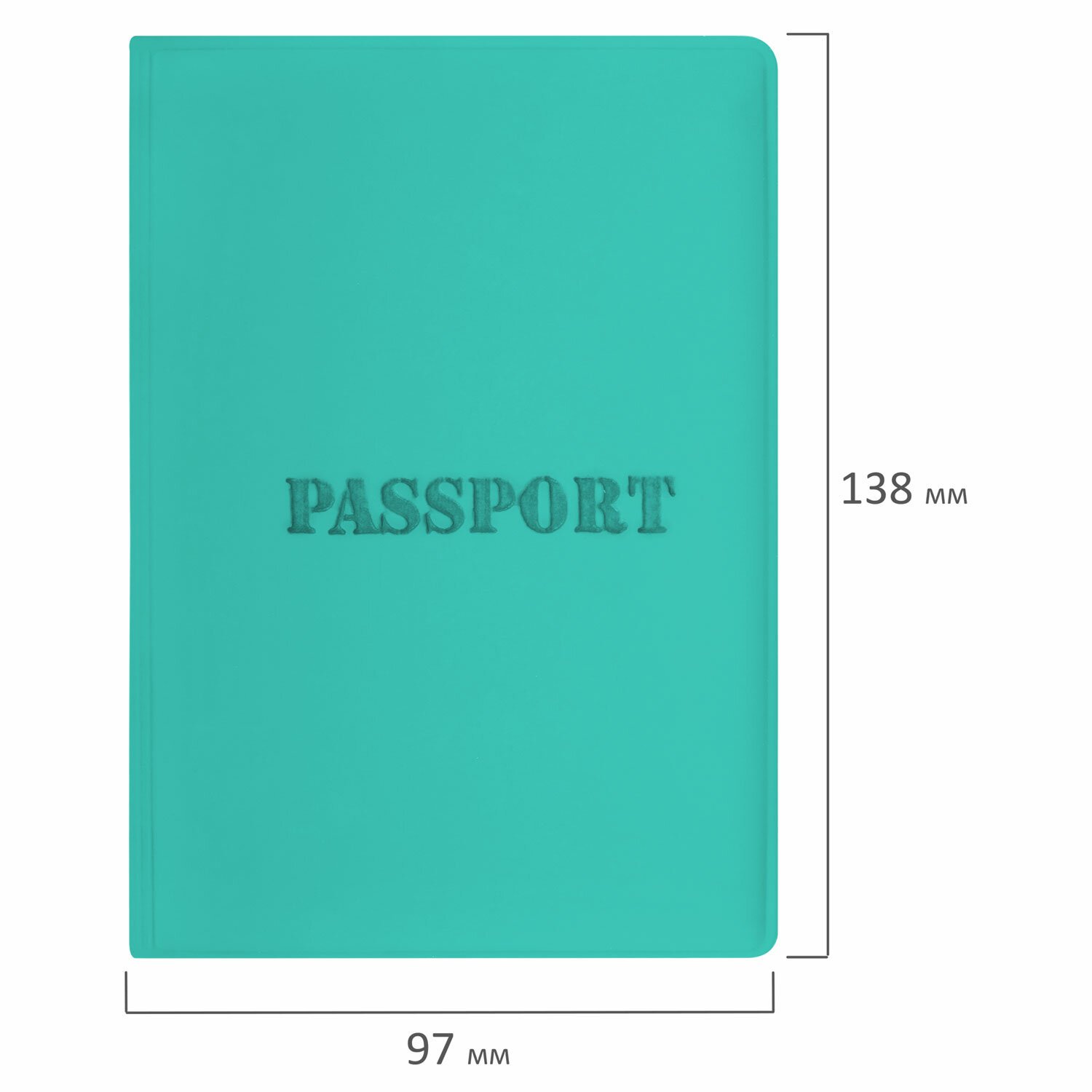 Модель выполнена из мягкого полиуретана в стильном цвете "тиффани" и украшена тисненой надписью "PASSPORT". На внутреннем развороте расположены два кармана из прозрачного пластика, а благодаря компактным размерам 97х138 мм документ в обложке удобно носить с собой.