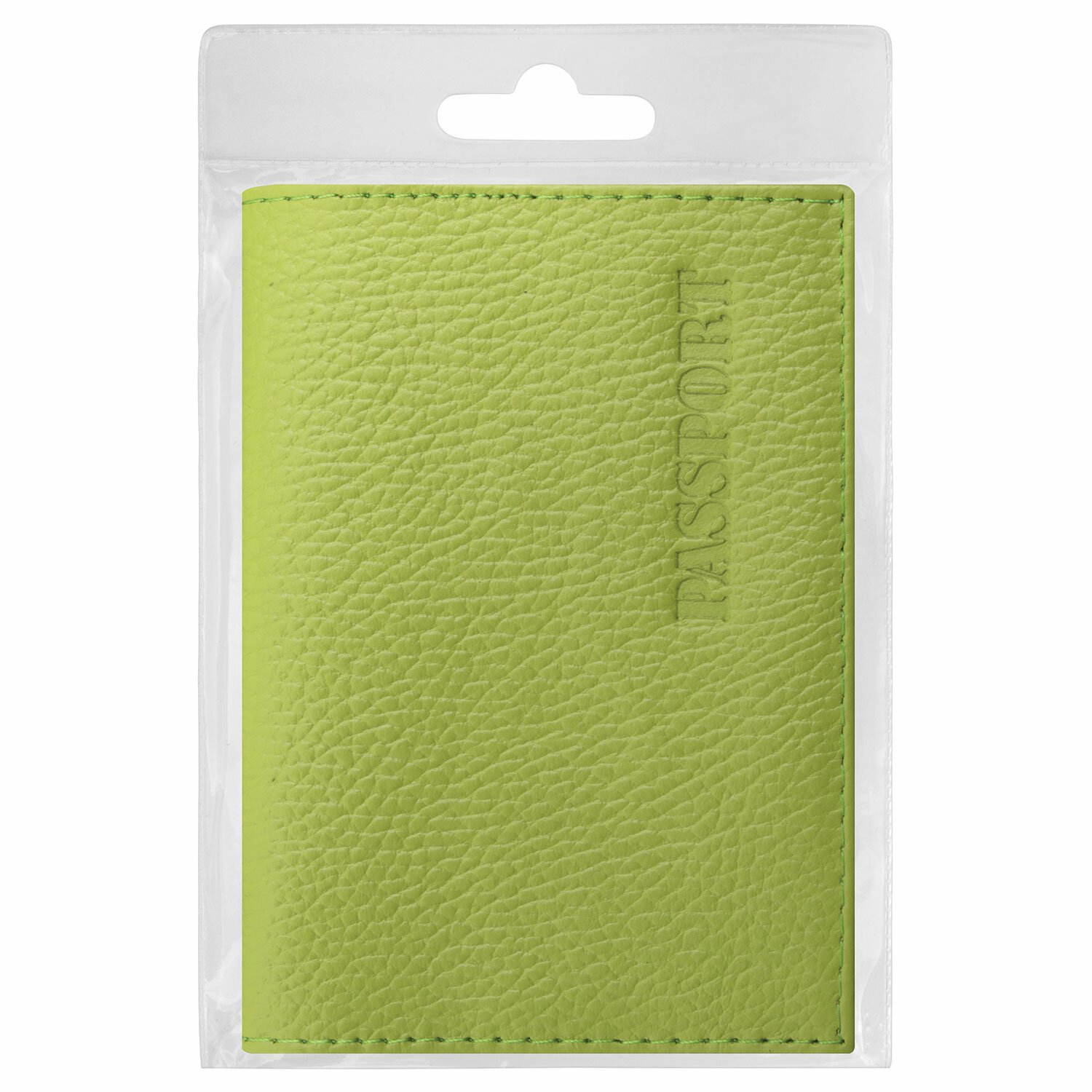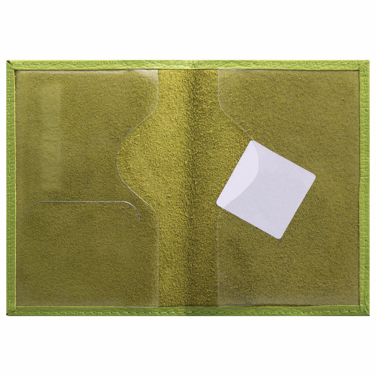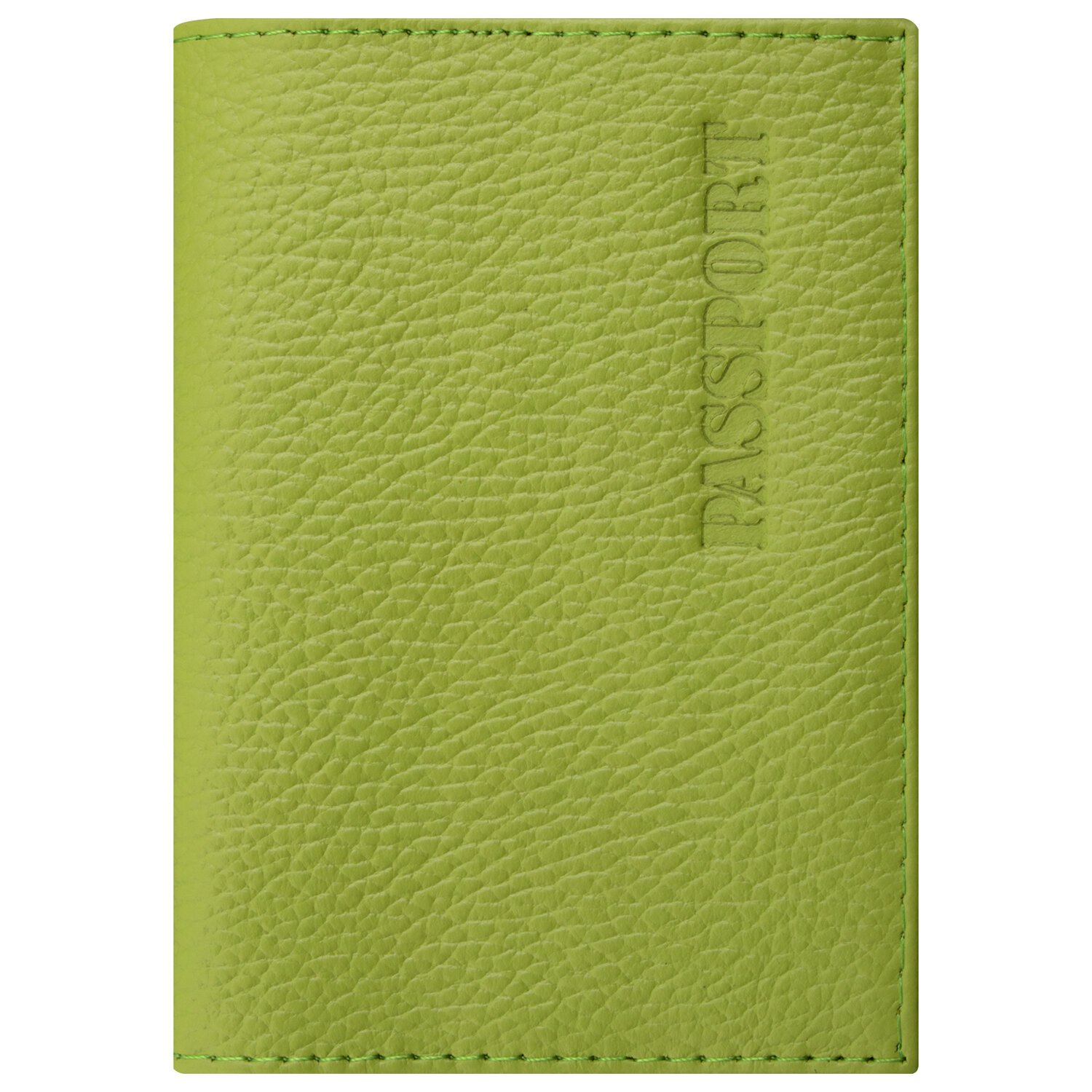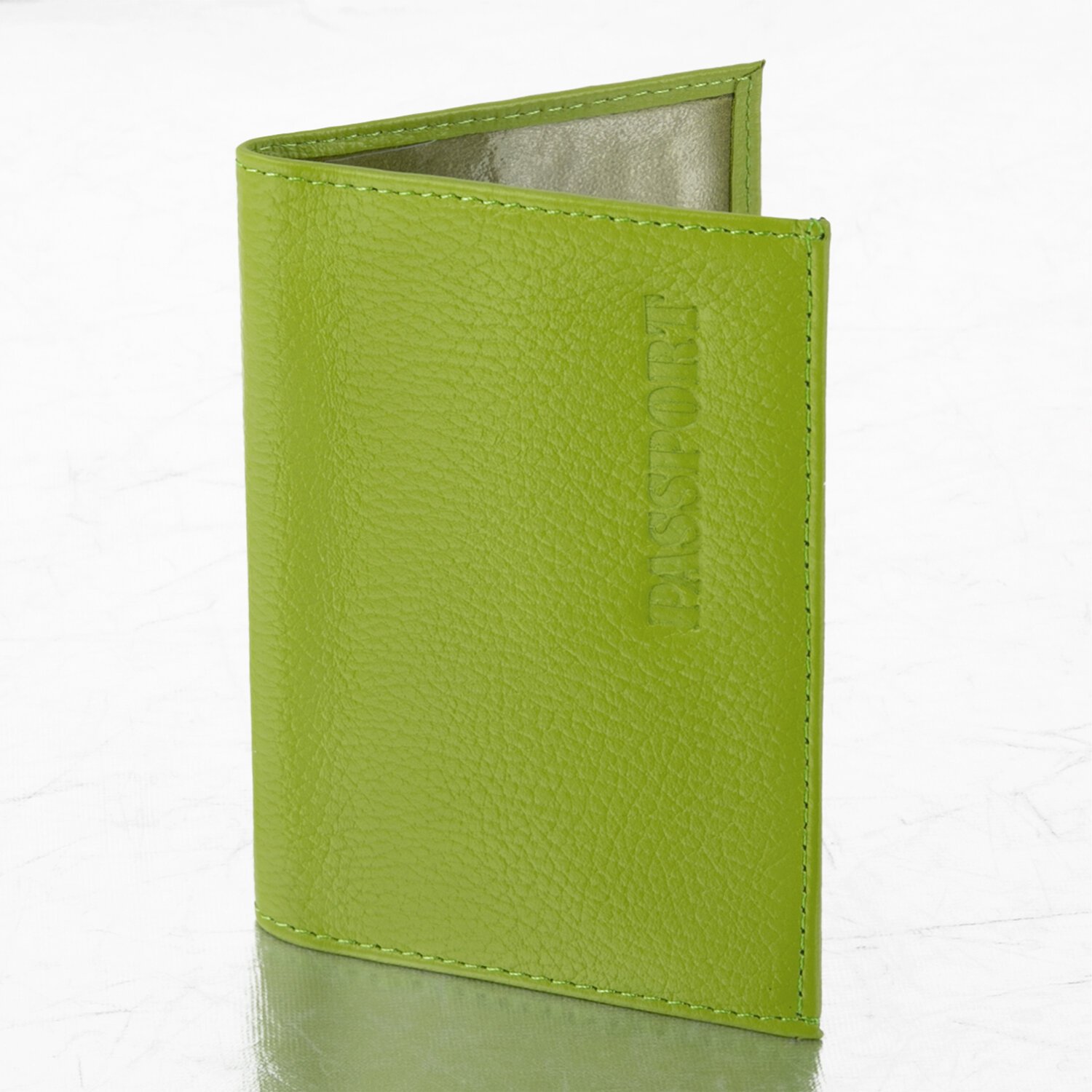 Модель выполнена из натуральной кожи флоттер салатового цвета и украшена тисненой надписью "Паспорт". Имеет простроченные края. На внутреннем развороте расположены два кармана из прозрачного пластика. Благодаря компактным размерам 97х138 мм удобно всегда носить с собой.