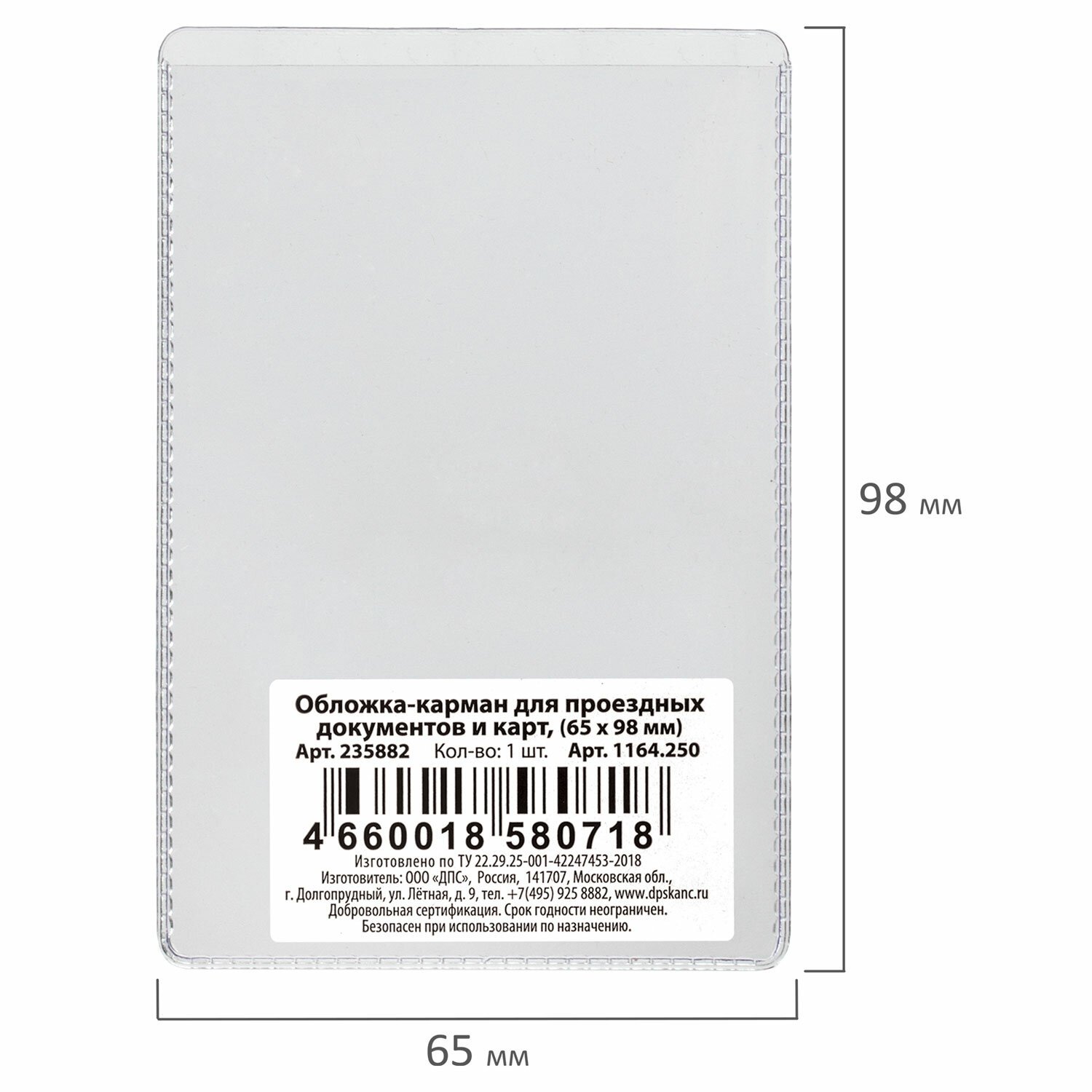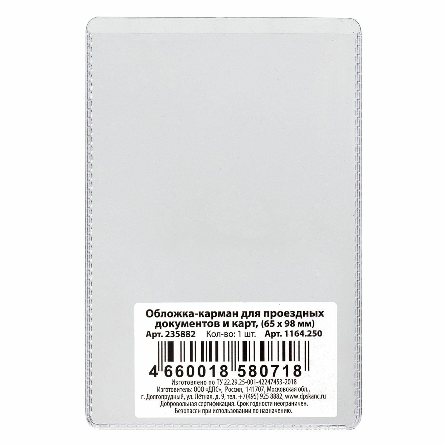 Обложка-карман для проездных документов, карт, пропусков, 98х65 мм, ПВХ, прозрачная, ДПС, 1164.250