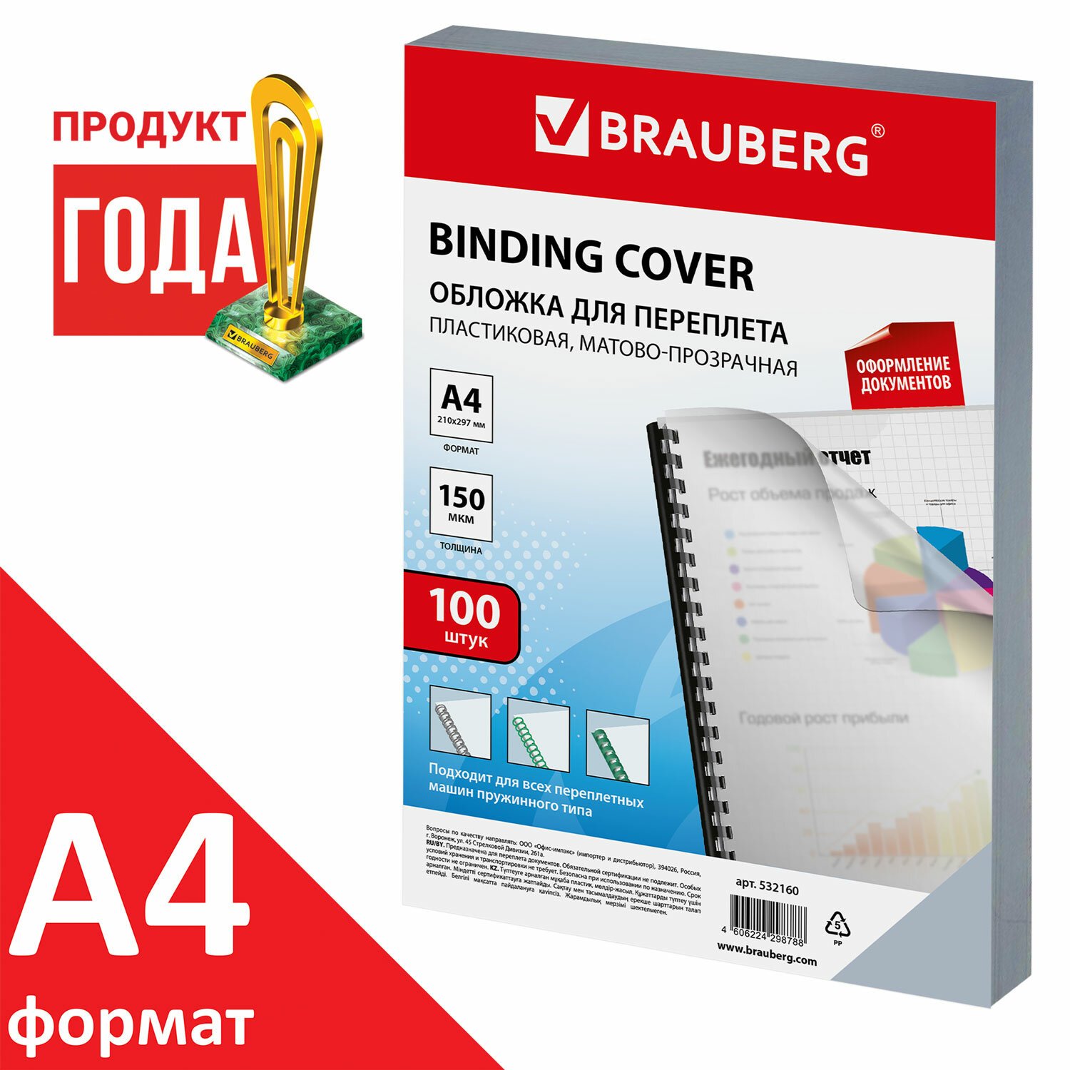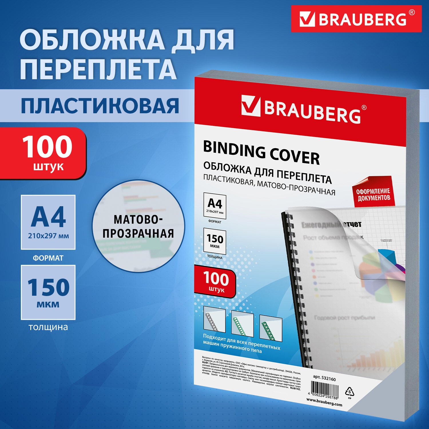 Обложки пластиковые для переплета, А4, КОМПЛЕКТ 100 шт., 150 мкм, матово-прозрачные, BRAUBERG, 532160