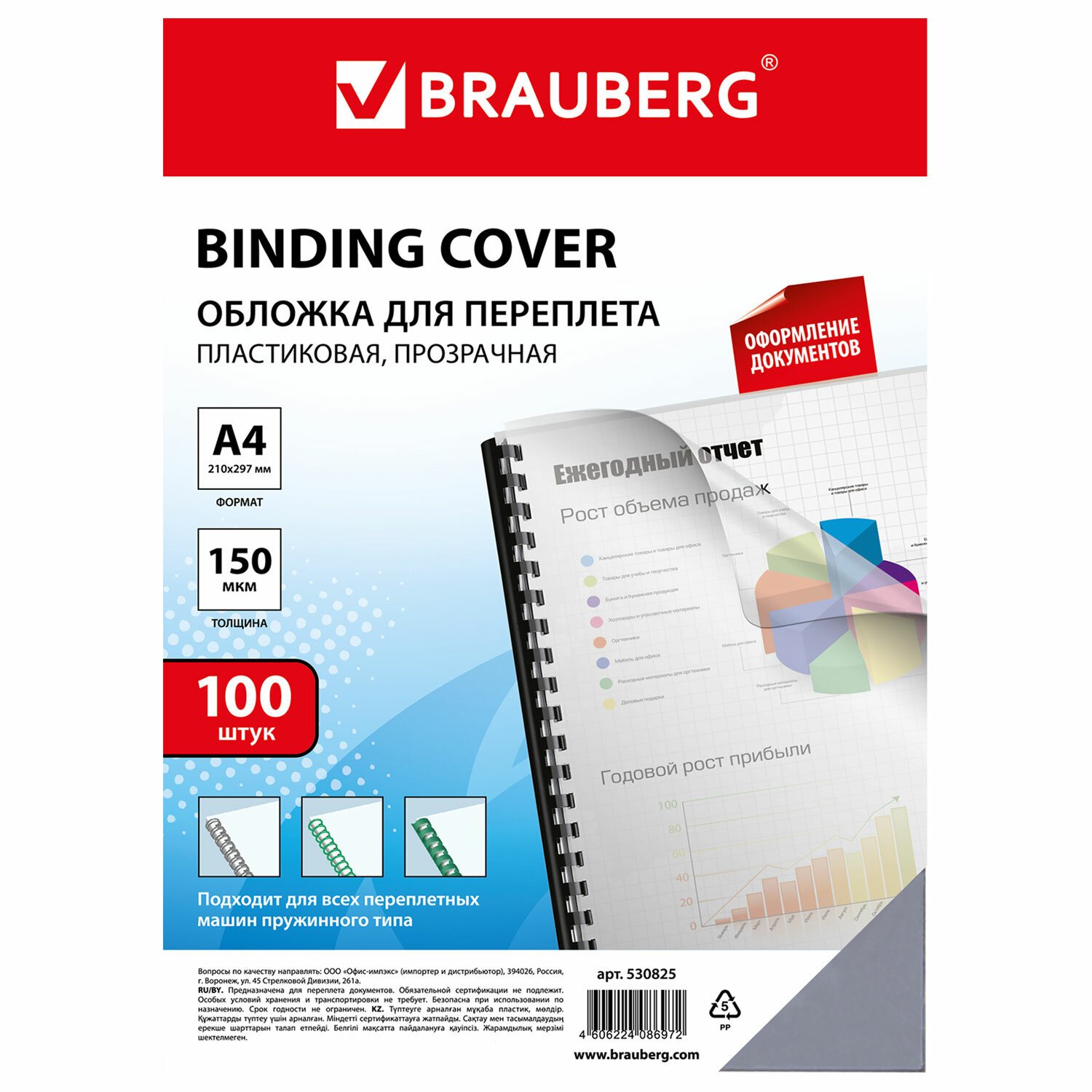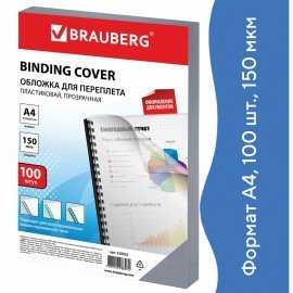 Обложки пластиковые для переплета, А4, КОМПЛЕКТ 100 шт., 150 мкм, прозрачные, BRAUBERG, 530825