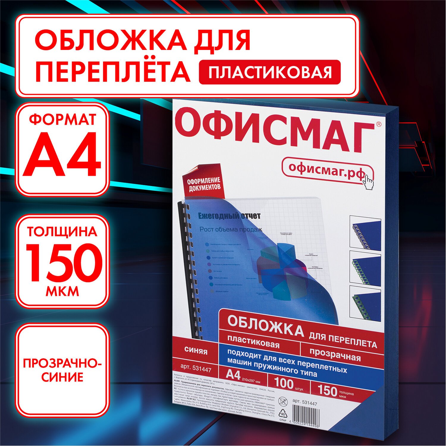 Обложки пластиковые для переплета, А4, КОМПЛЕКТ 100 шт., 150 мкм, прозрачно-синие, ОФИСМАГ, 531447