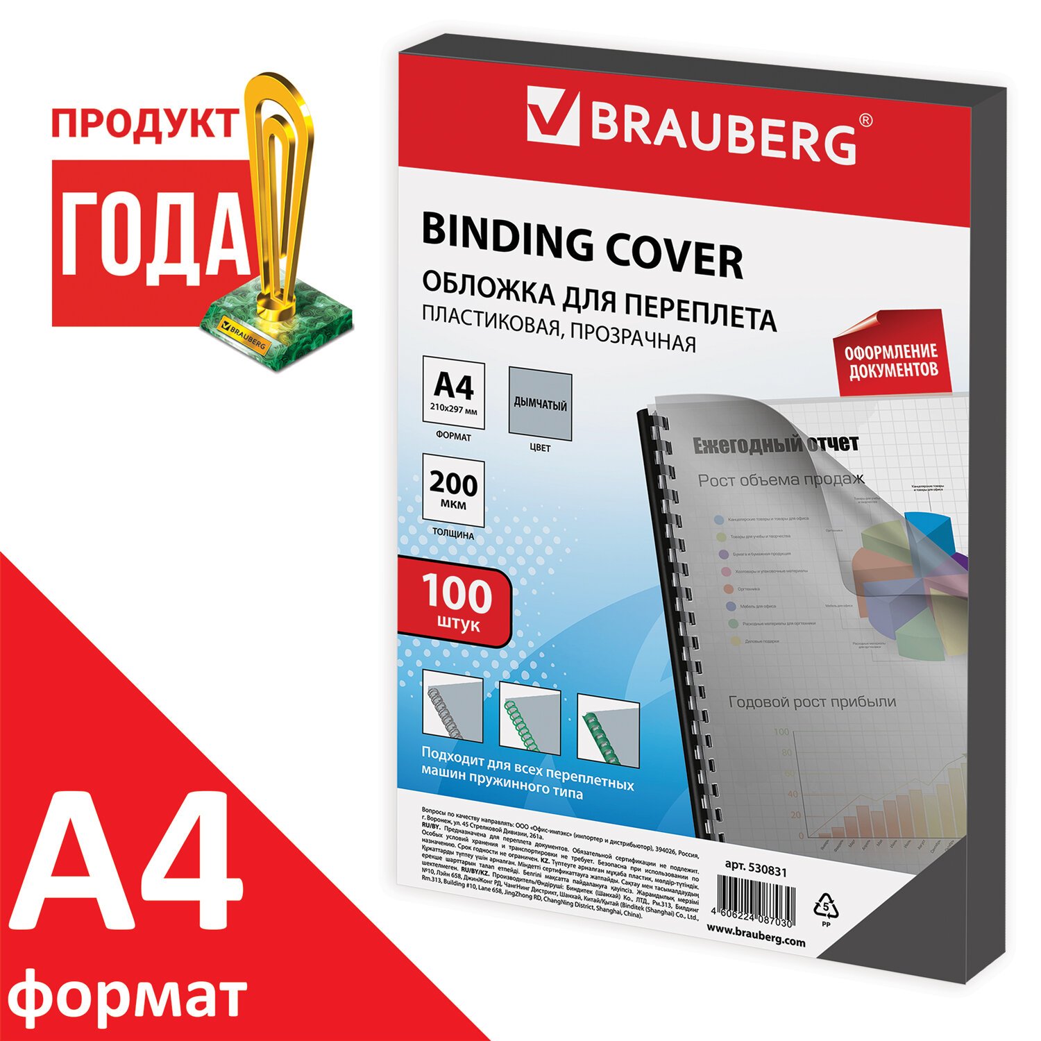 Обложки пластиковые для переплета, А4, КОМПЛЕКТ 100 шт., 200 мкм, прозрачно-дымчатые, BRAUBERG, 530831