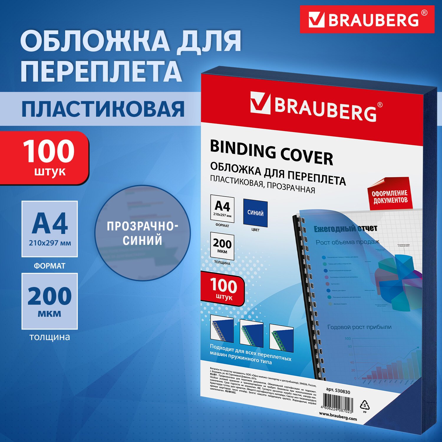 Обложки пластиковые для переплета, А4, КОМПЛЕКТ 100 шт., 200 мкм, прозрачно-синие, BRAUBERG, 530830