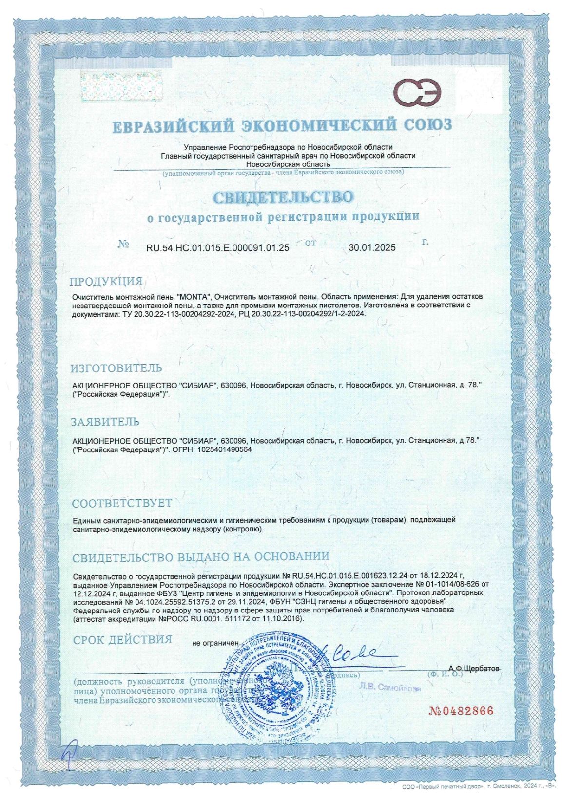 Способ применения. Для промывки монтажного пистолета - открыть защитный колпачок на баллоне очистителя монтажной пены. Снять монтажный пистолет с использованного баллона полиуретановой пены. Установить монтажный пистолет на баллон очистителя монтажной пены. Нажать несколько раз на регулировочный курок пистолета, пока выходящая из трубки струя не будет содержать остатки пены. Отсоединить пистолет от баллона очистителя монтажной пены. Проверить чистоту инструмента.