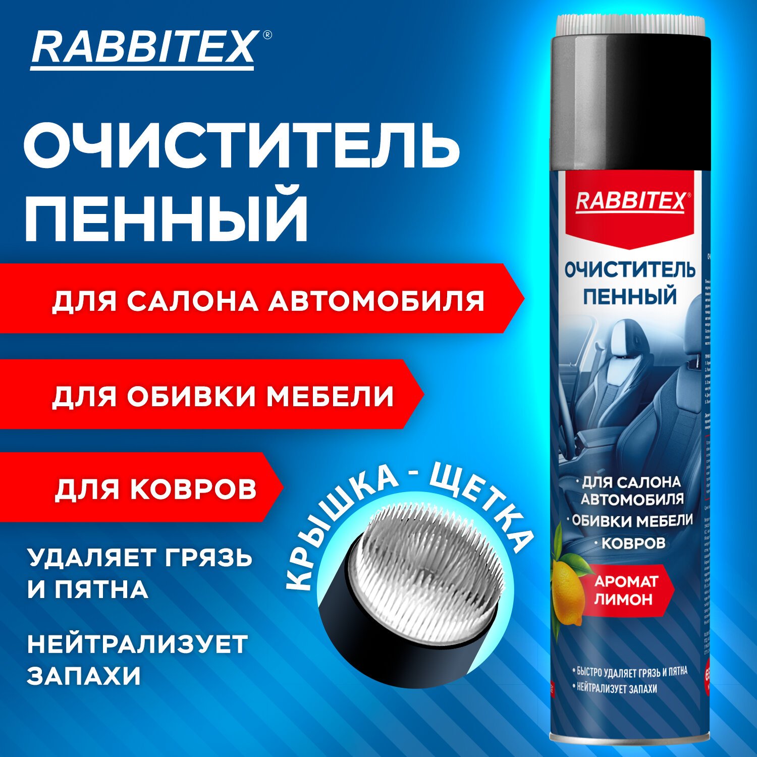 Пенный очиститель RABBITEX с удобной щеткой на крышке обеспечивает глубокую и бережную чистку тканевых поверхностей как в доме, так и в автомобиле. Активная пена эффективно проникает в волокна ткани и легко справляется даже с застарелыми пятнами.