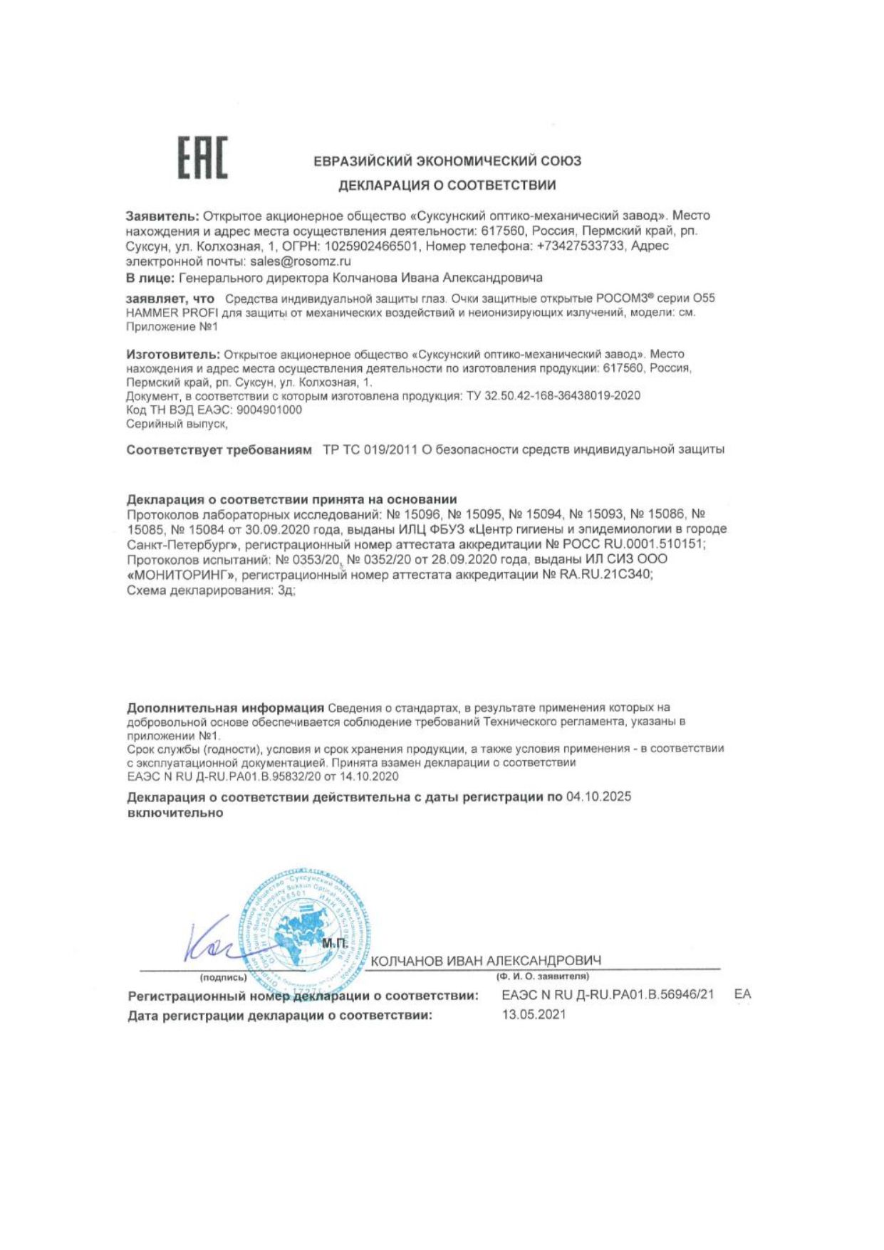 Очки защитные открытые РОСОМЗ О55 Hammer Profi super, прозрачные, незапотевающее покрытие, устойчивы к химическим веществам, поликарбонат, 15530