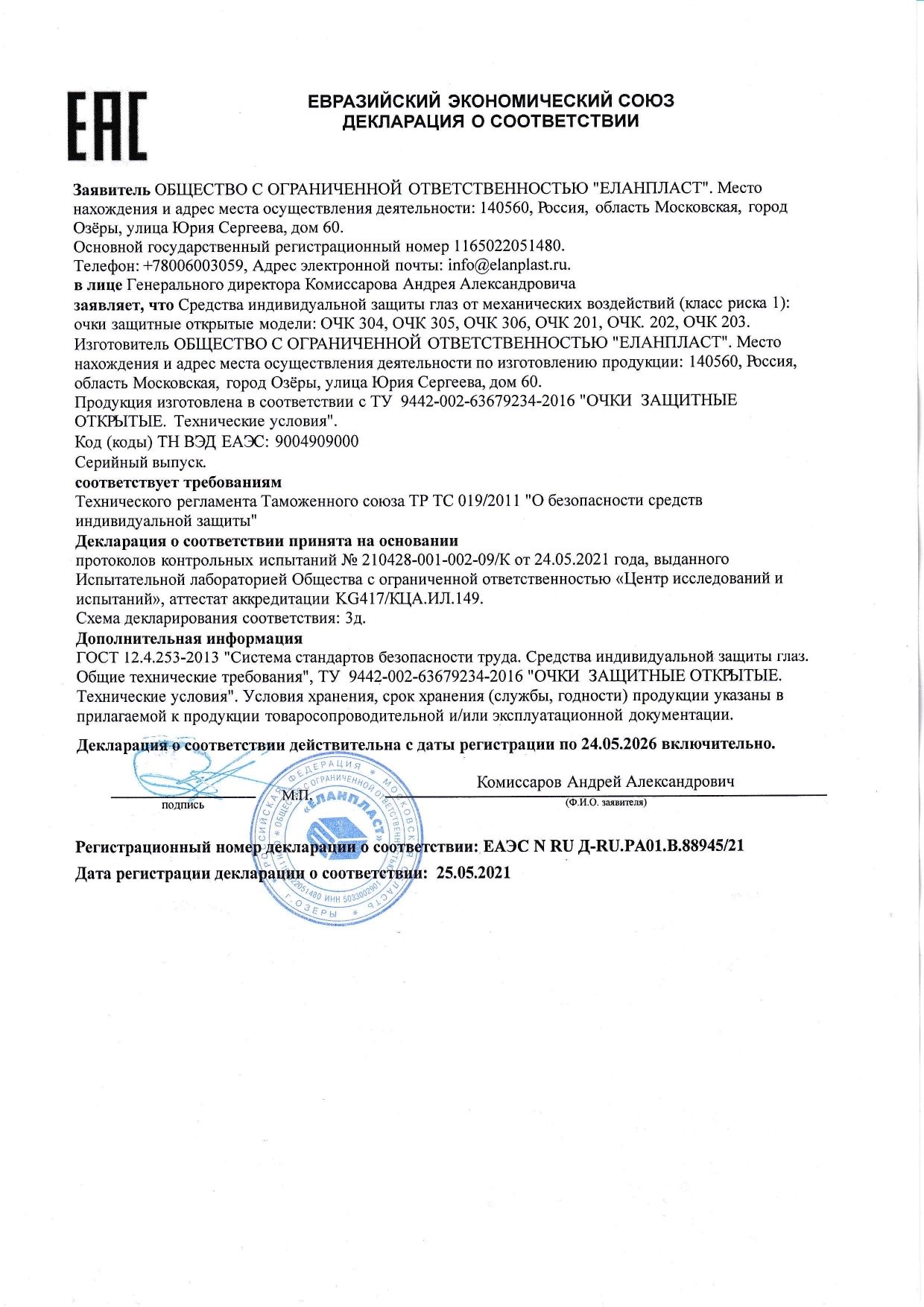 Изготовлены из ударопрочного поликарбоната, имеют верхнюю и боковую защиту. Очки современного дизайна с прозрачными линзами, не имеют ограничения по сроку ношения.