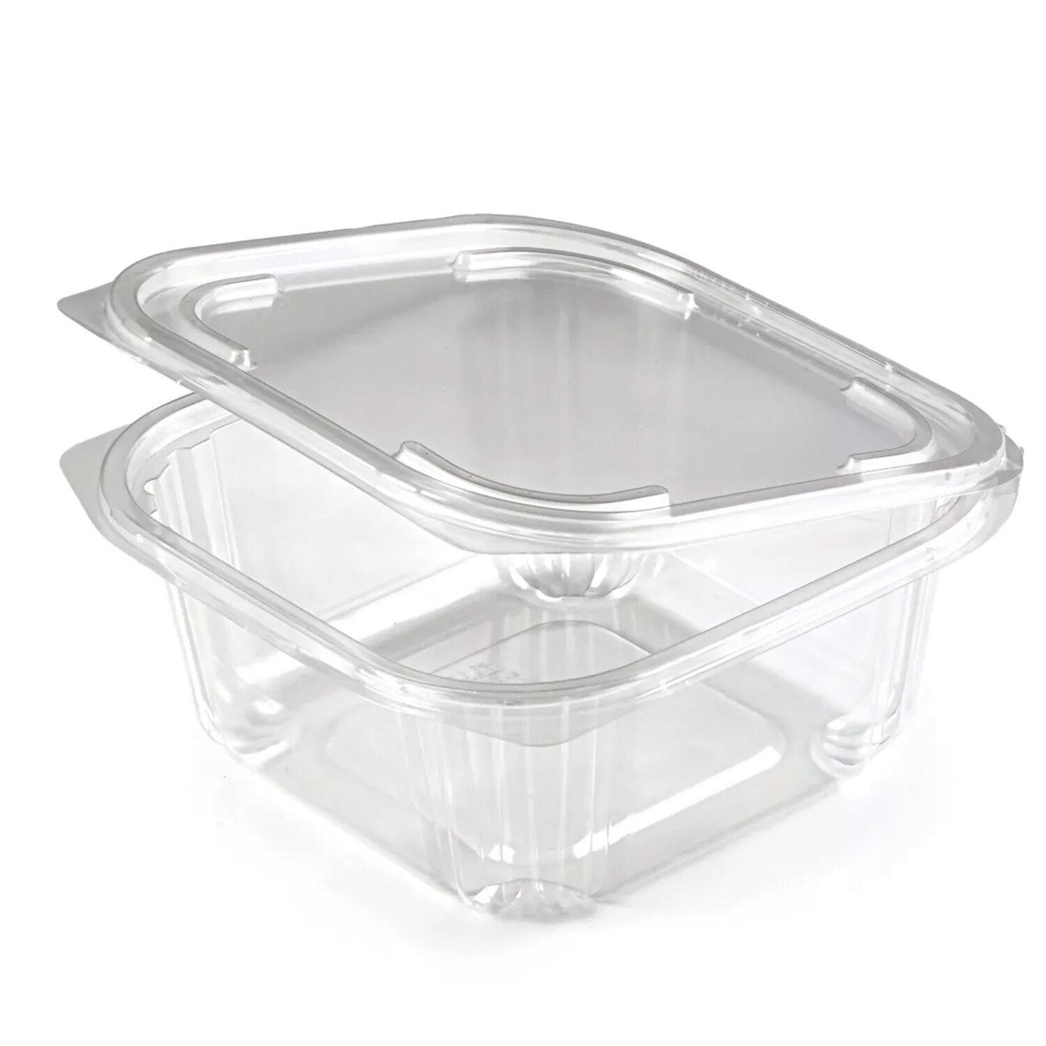 Контейнеры с рёбрами жёсткости по углам и неразъёмной крышкой. Надёжное штабелирование. Изготовлены из пищевого пластика. Крышка плотно и крепко облегает пищевой контейнер, что снижает вероятность контакта продуктов с внешней средой. Разогрев в микроволновке не допускается.