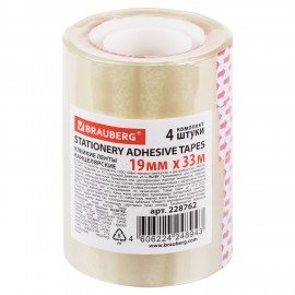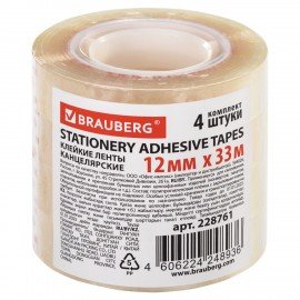 Клейкие ленты 12 мм х 33 м канцелярские BRAUBERG, КОМПЛЕКТ 4 шт., прозрачные, гарантированная длина, 228761