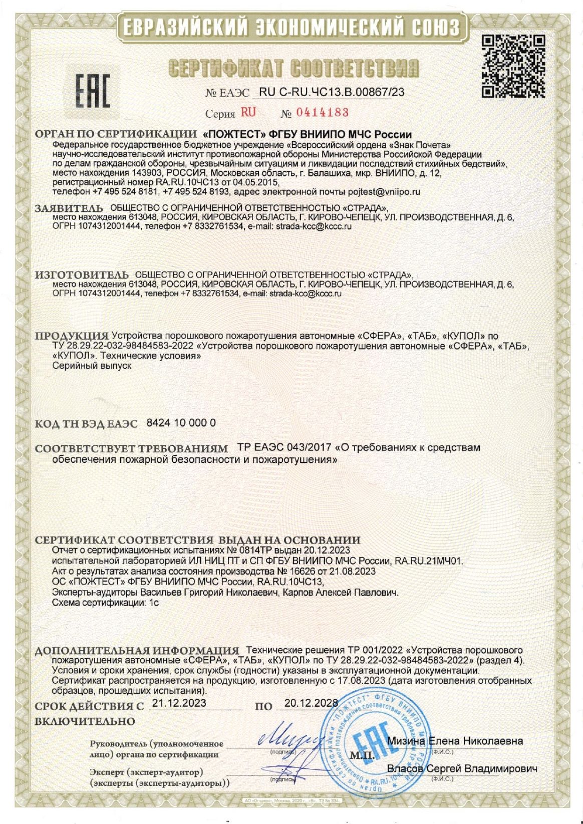 Имеет обязательную сертификацию ФГБУ ВНИИПО МЧС России.