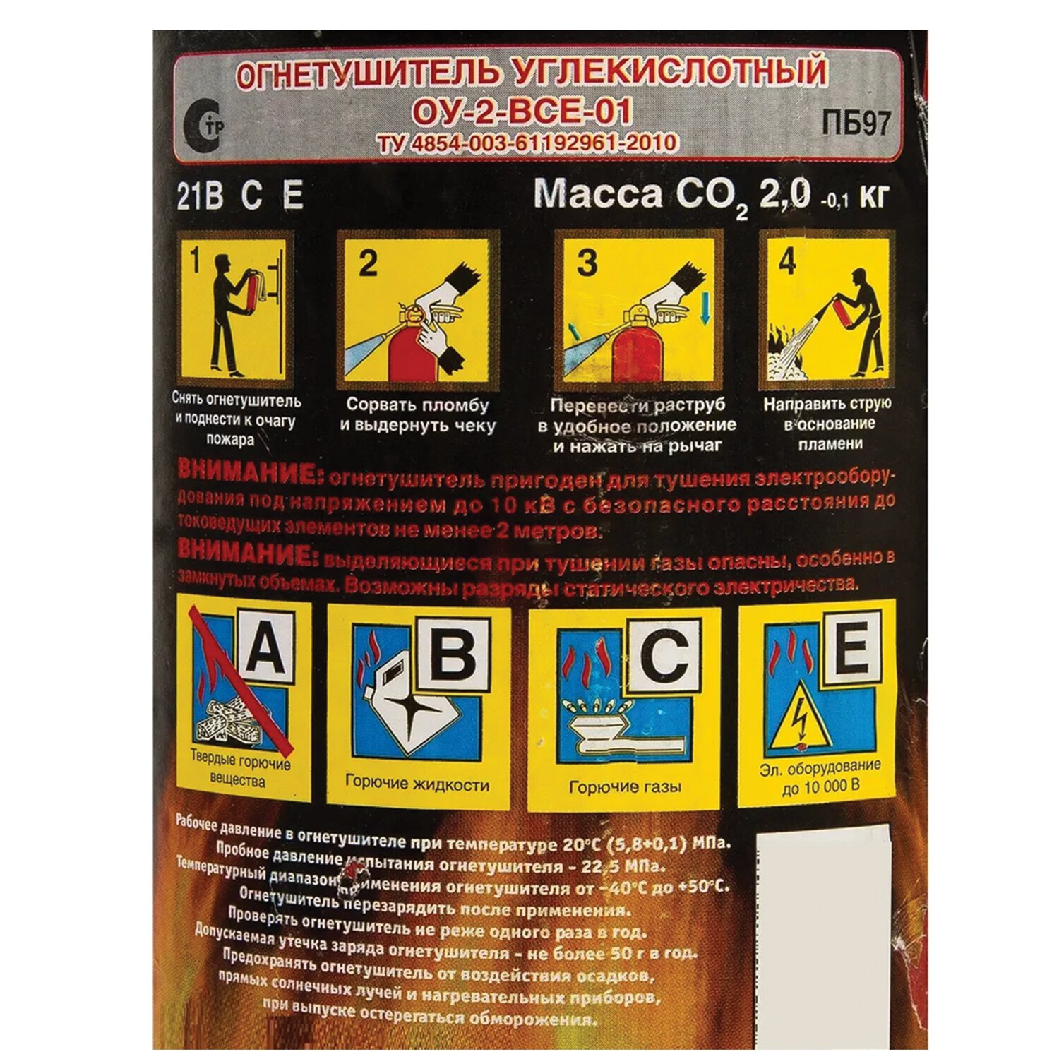Огнетушитель углекислотный ОУ-2 применяется для первичного тушения пожаров и возгораний класса B, C, E (горючие и легковоспламеняющиеся жидкости, горючие газы, электроустановки, не превышающие напряжение 10000 Вольт).