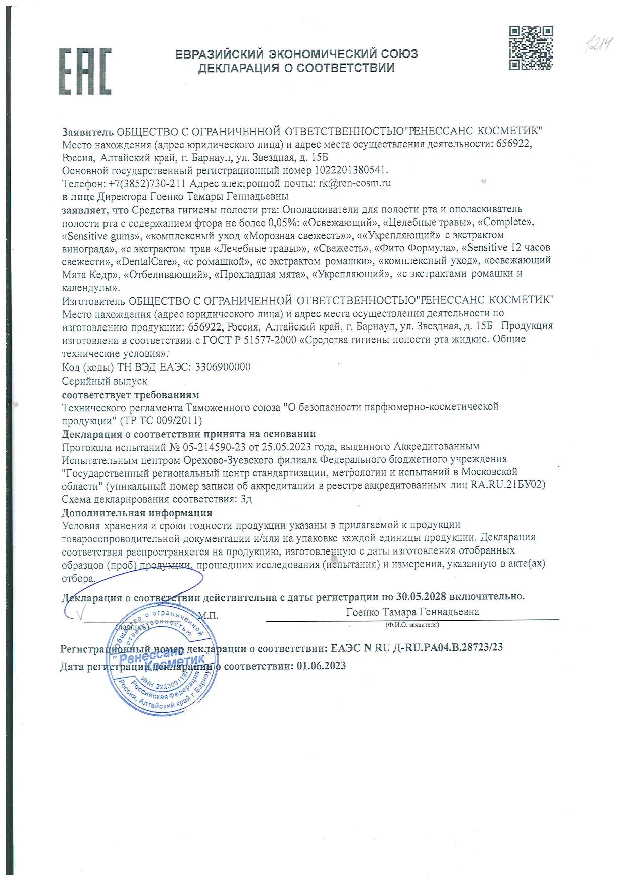 Меры предосторожности: не глотать, использовать только для полоскания, избегать контакта с глазами, хранить в недоступном для детей месте.