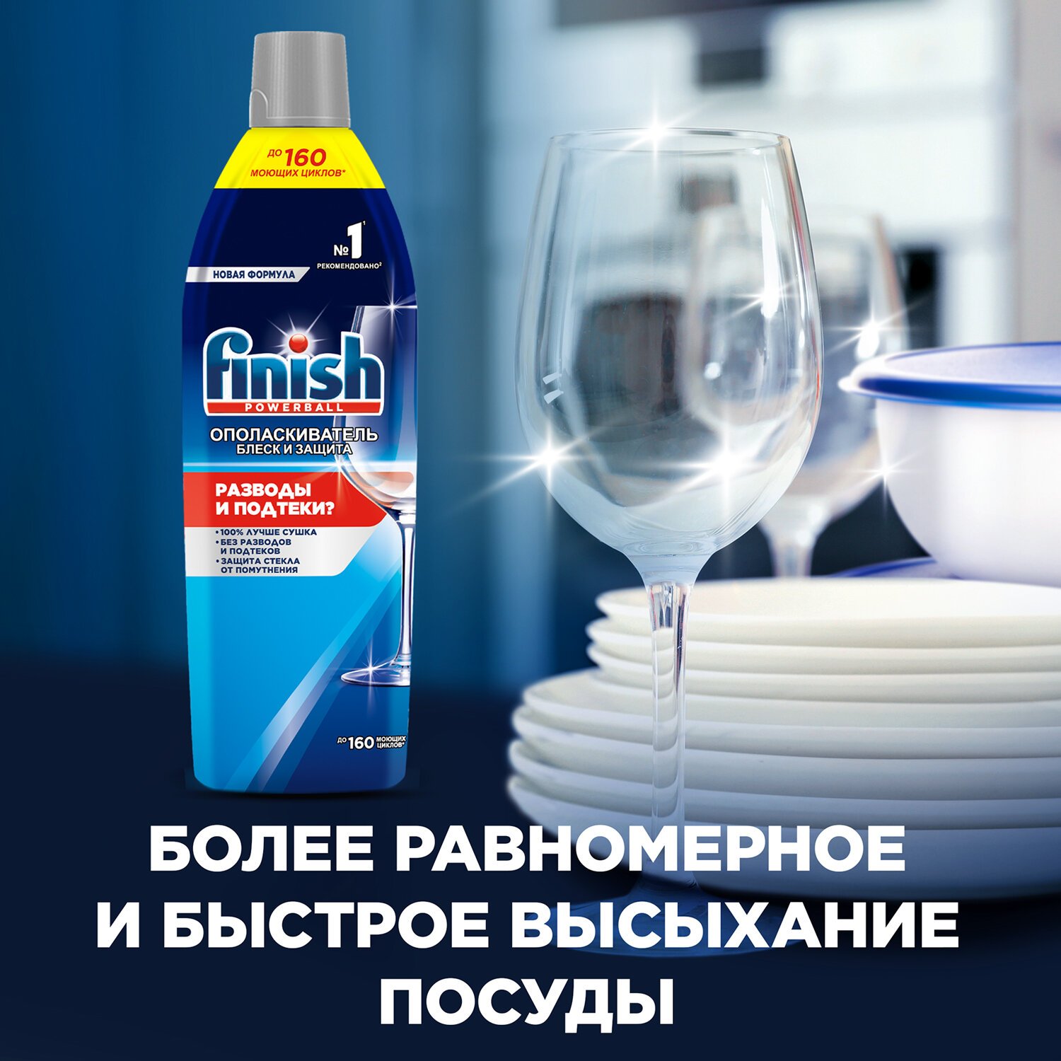 Ополаскиватель для посудомоечных машин FINISH "Блеск и защита" улучшает сушку и придает посуде больше блеска.