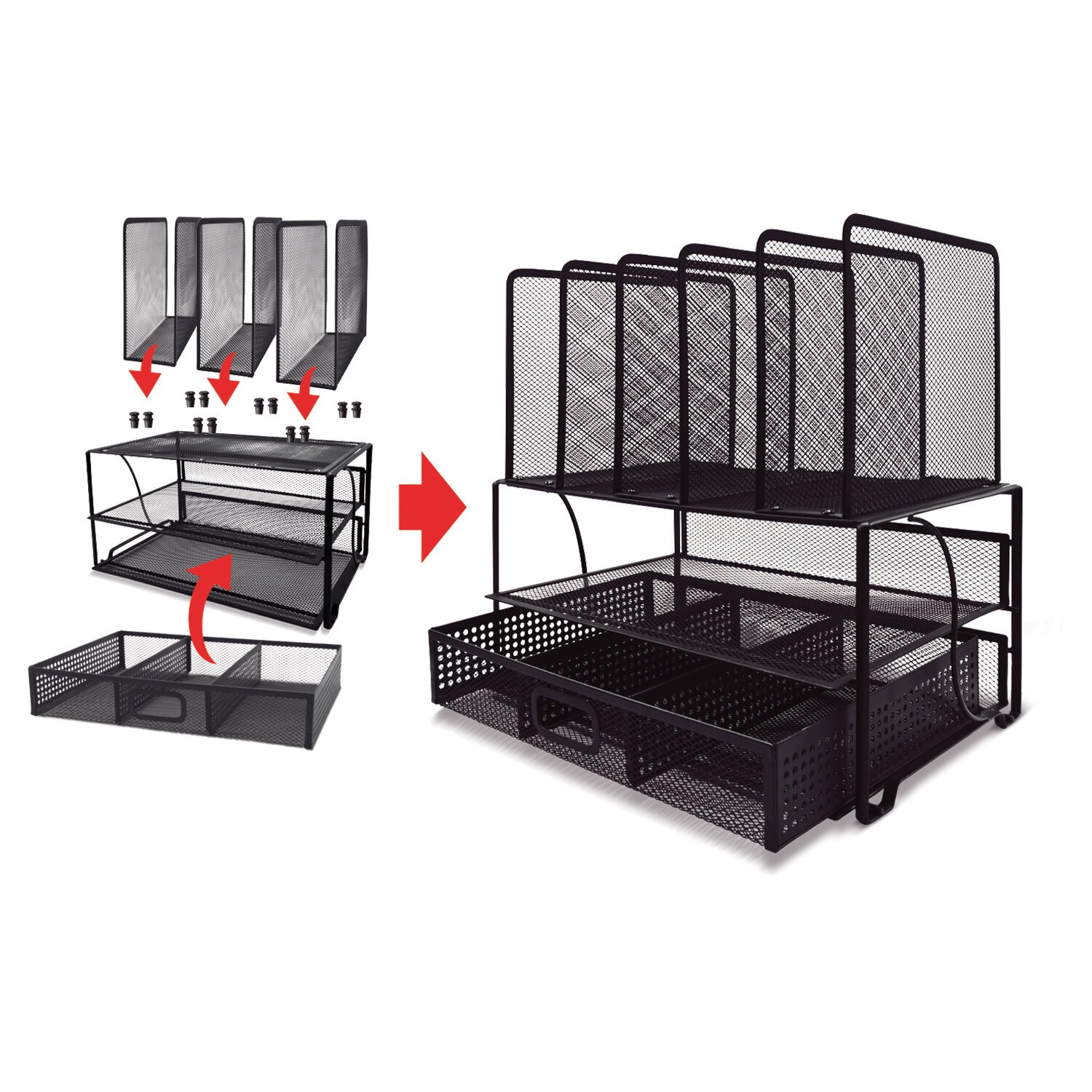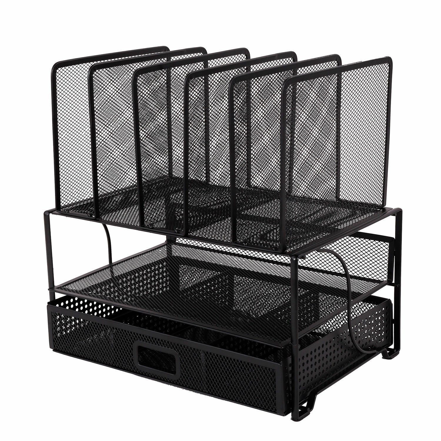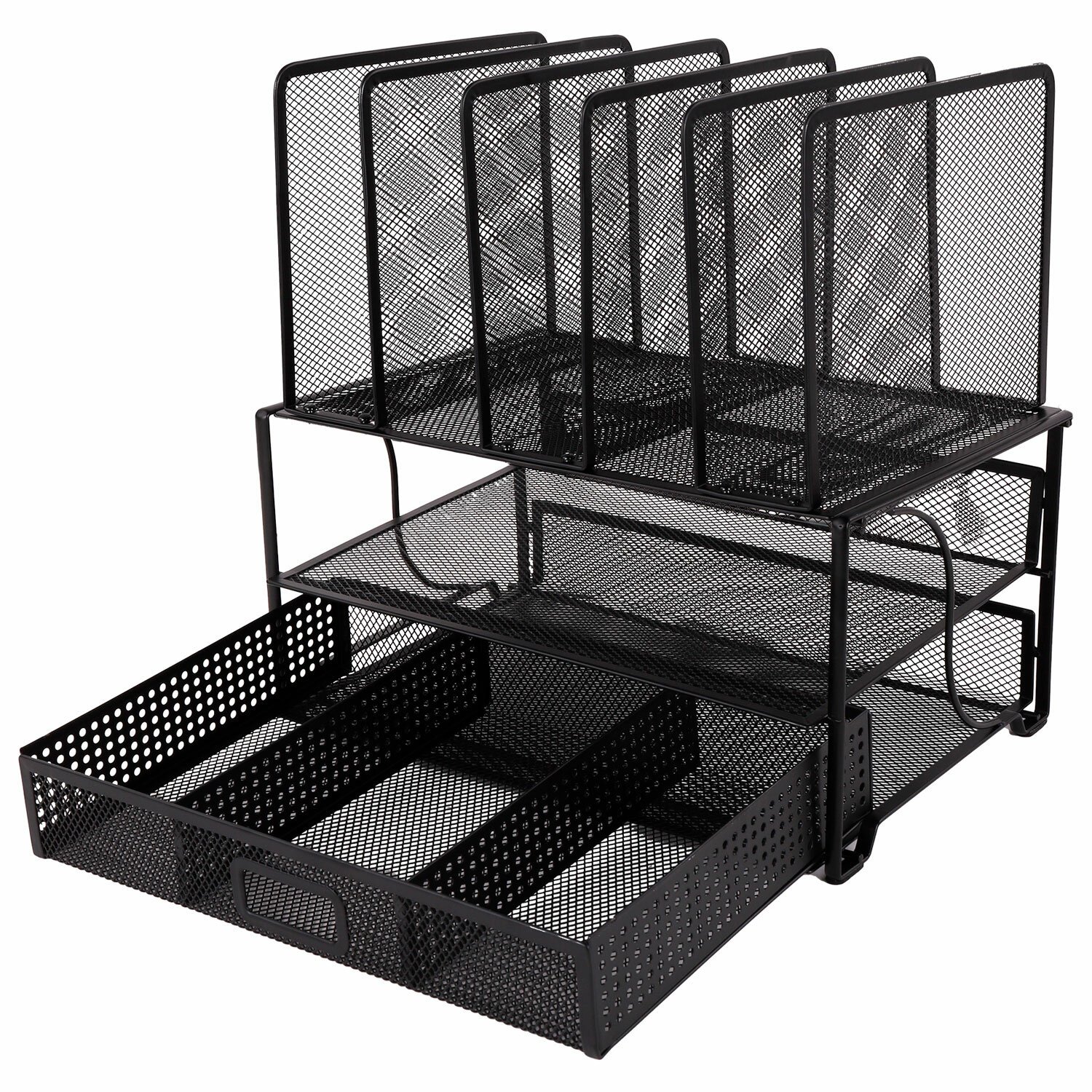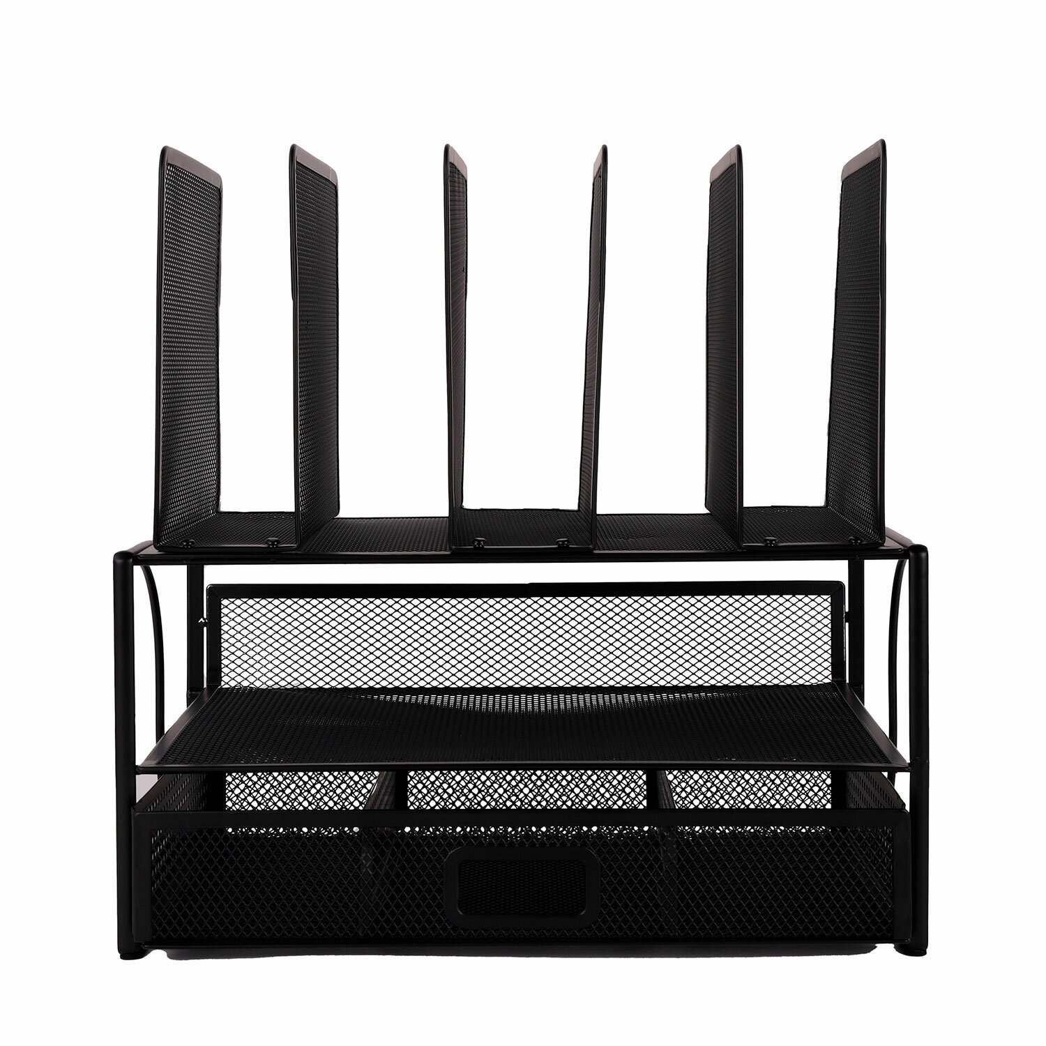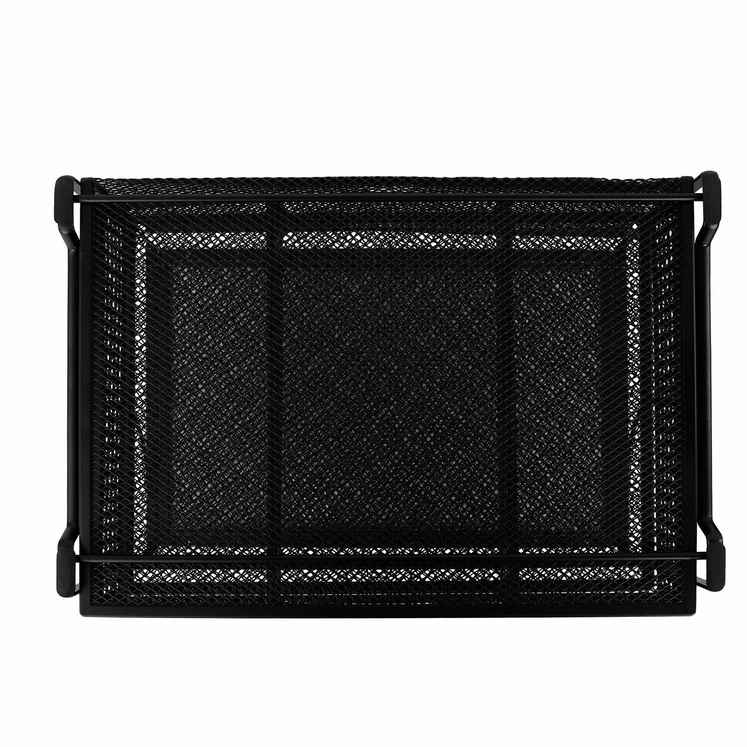 Изготовлен из металлической сетки. Имеет размеры 335х228х335 мм. Состоит из девяти секций. Мягкие подушечки на основании предотвращают скольжение и порчу мебели. Поставляется без канцелярского наполнения.