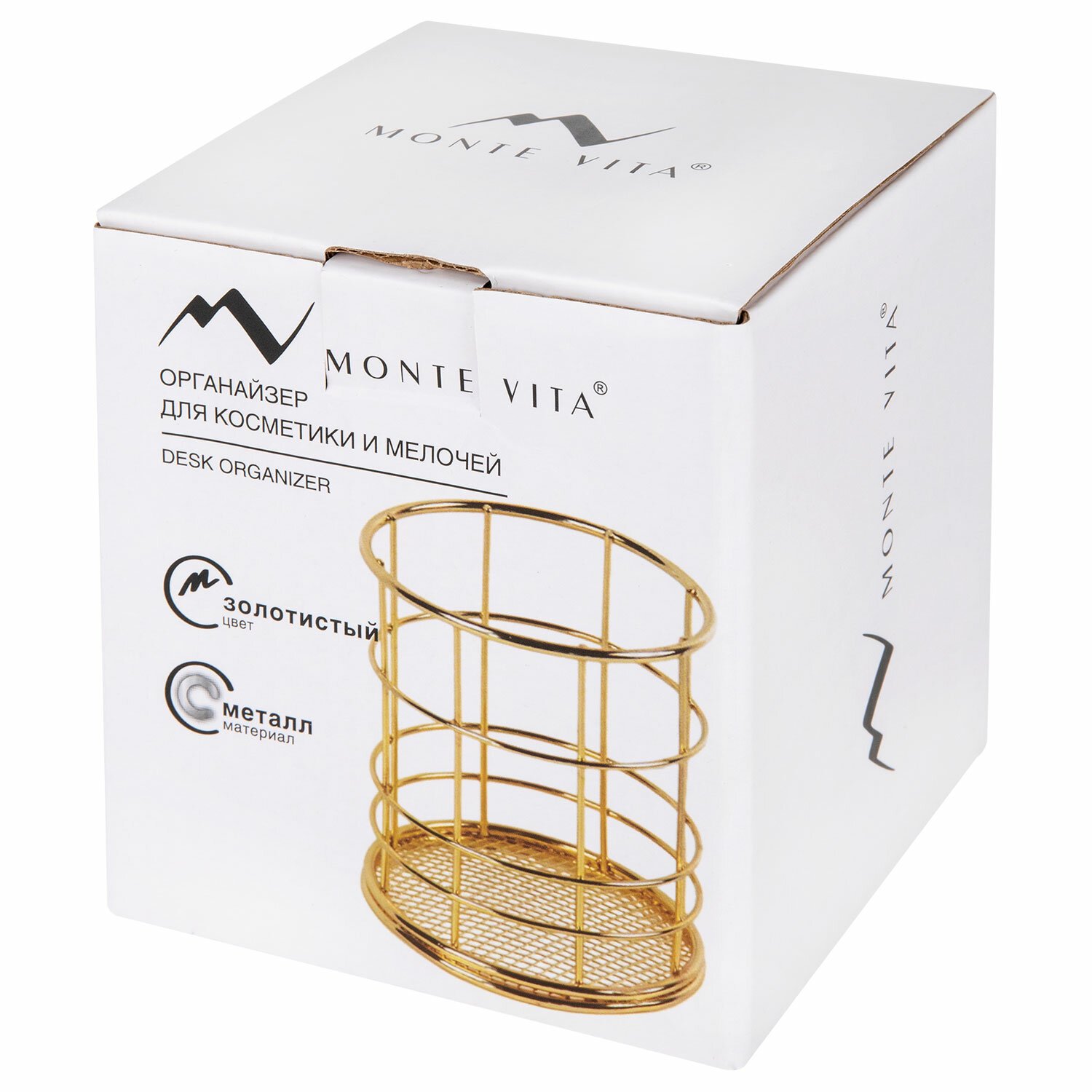 Изготовлен из металла. Имеет размер 100х90 мм. Благодаря своему стильному дизайну, удобству использования и надёжности, органайзер MONTE VITA станет незаменимым аксессуаром для вашего комфорта. Он обеспечит удобное хранение вашей канцелярии, косметики и прочих мелочей, а также легкий доступ к ним.