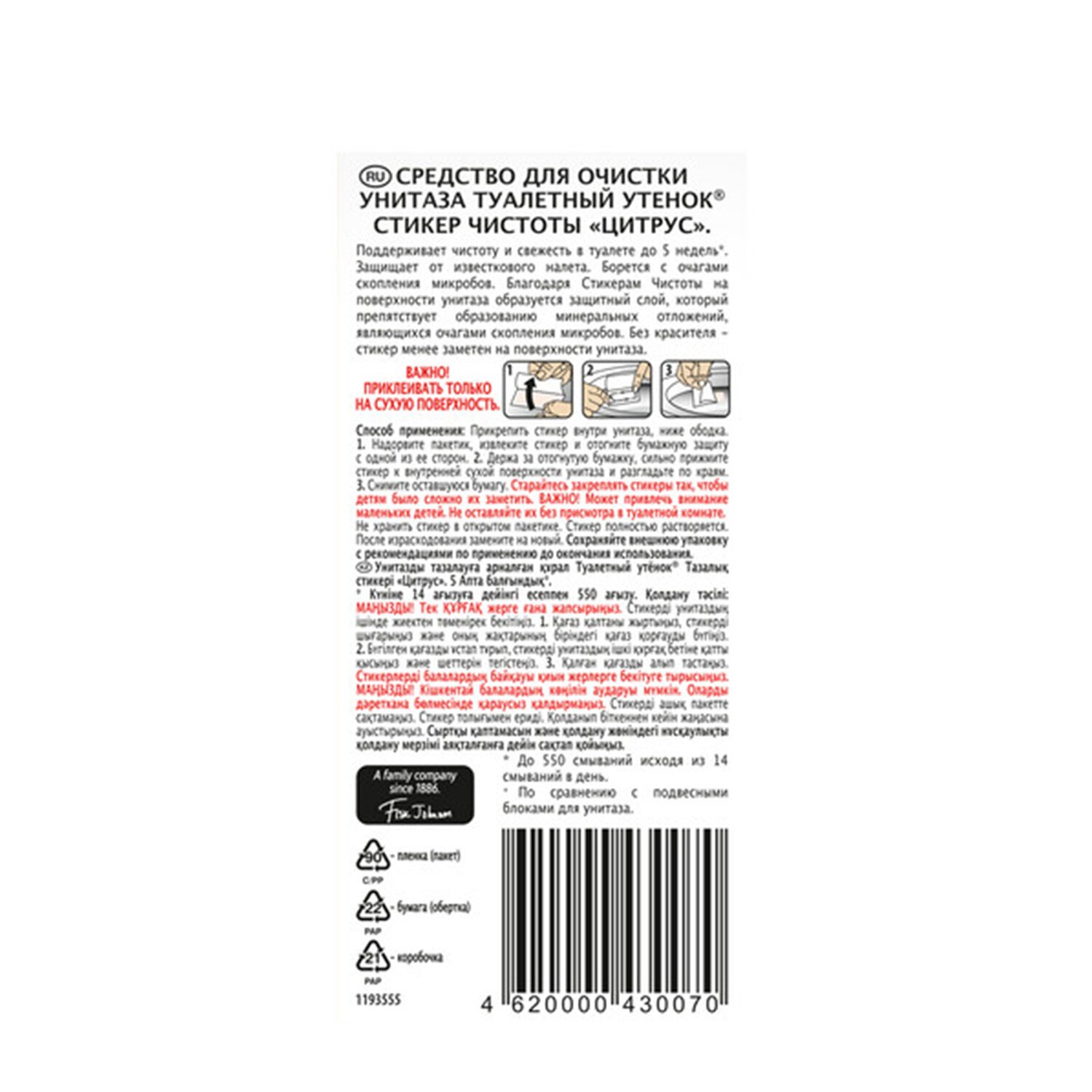 Туалетный Утенок "Стикеры Чистоты" поддерживают чистоту и свежесть в туалете до 5 недель. Защищают от известкового налета, борются с очагами скопления микробов. Стикер легко крепится к внутренней поверхности унитаза, оставляет приятный свежий аромат.