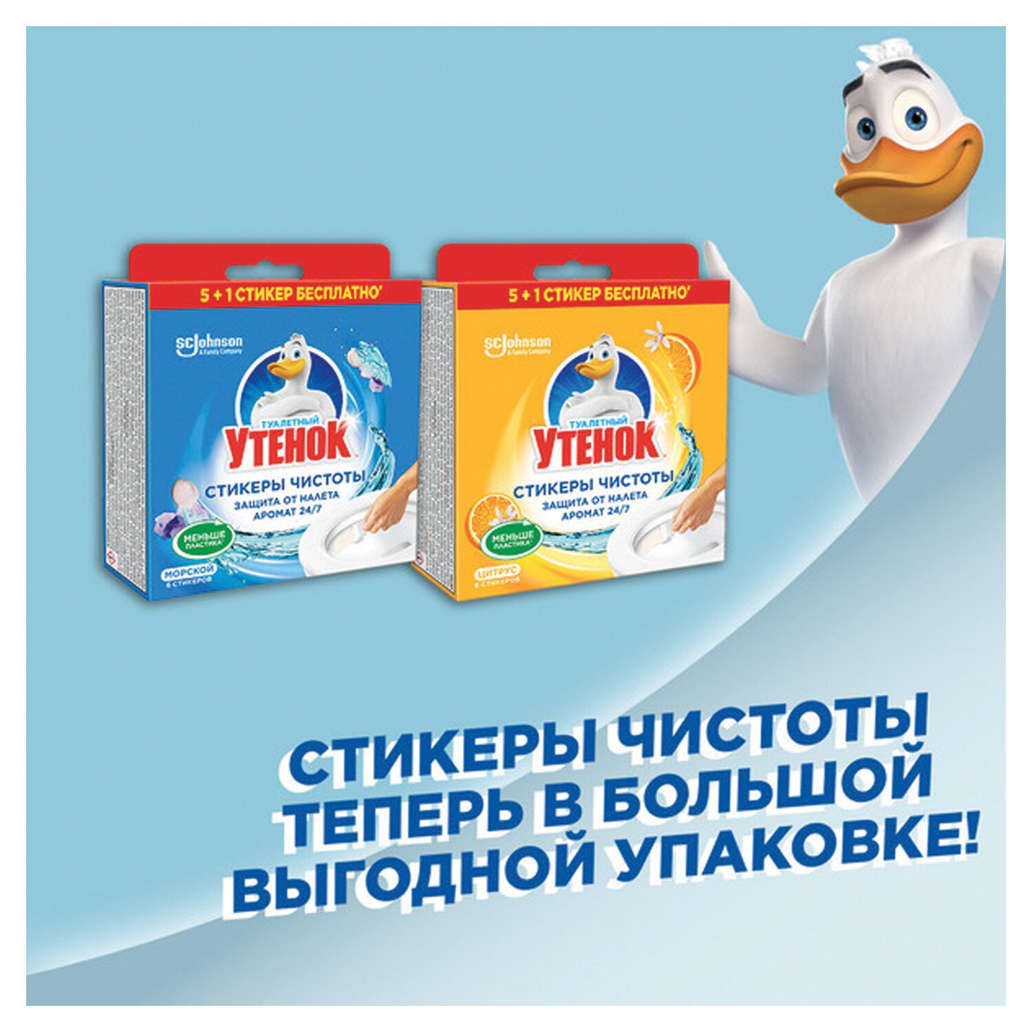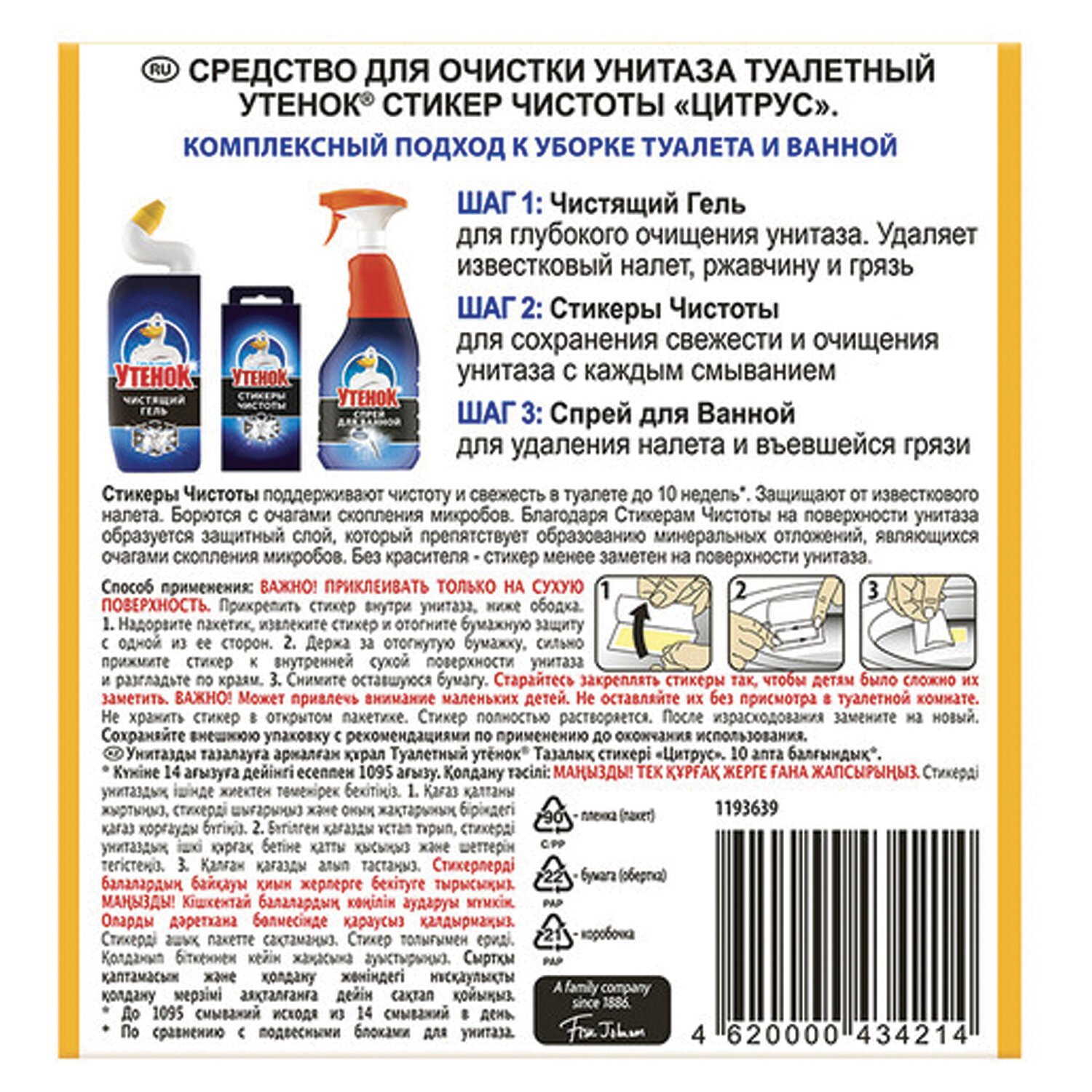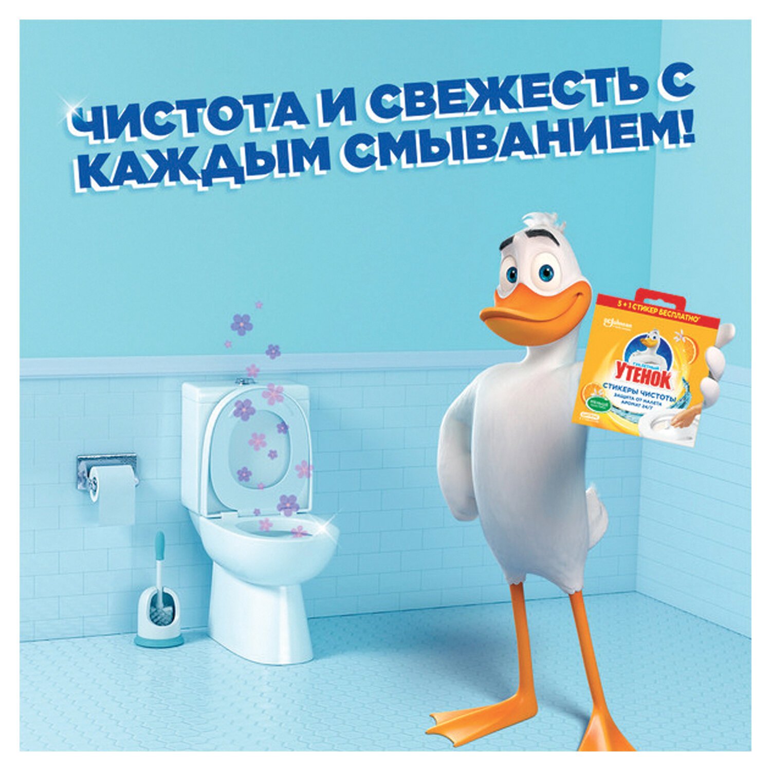 Туалетный Утенок "Стикеры Чистоты" поддерживают чистоту и свежесть в туалете до 10 недель. Защищают от известкового налета, борются с очагами скопления микробов. Стикер легко крепится к внутренней поверхности унитаза, оставляет приятный свежий аромат.