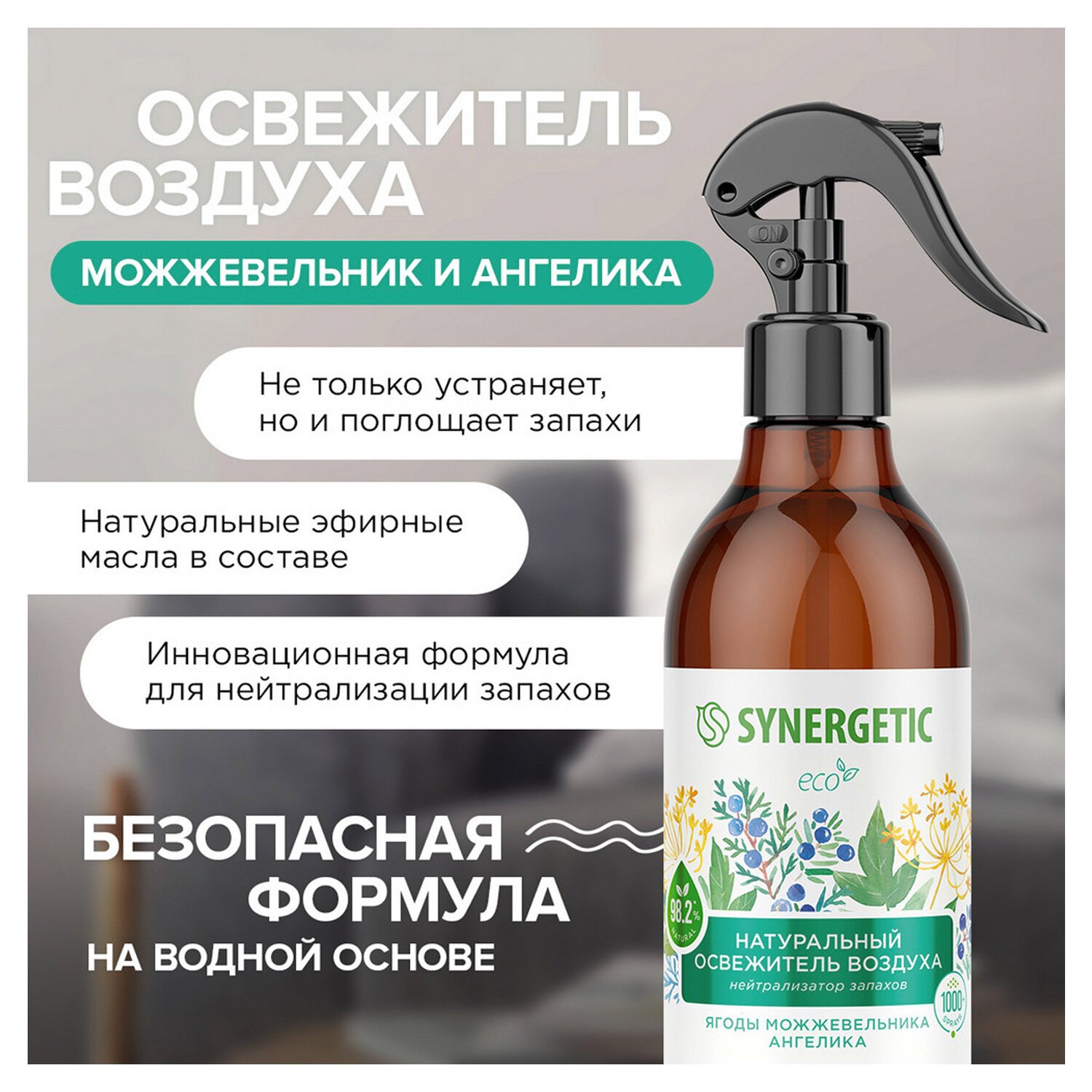 Биоразлагаемый освежитель воздуха, нейтрализатор запахов SYNERGETIC "Ягоды можжевельника и ангелика" на водной основе – это безопасная формула с высокой концентрацией натуральных компонентов. Парфюмерная композиция с эфирными маслами сосны, ягод можжевельника и эвкалипта наполняет воздух свежим хвойным ароматом. Гипоаллергенная формула безопасна для людей и животных. Благодаря натуральному поглотителю запахов - соли полиитаконовой кислоты - освежитель эффективно устраняет, а не маскирует стойкие запахи от приготовления пищи, домашних животных, табака и других источников неприятных запахов в гостиной, ванной комнате и санузле, спальне, коридоре, кухне, автомобиле, офисе и прочих помещениях. Подходит для устранения неприятных запахов с тканей (диванов, подушек, ковров, занавесок, простыней, тканевых автокресел, постельного белья), занавесок для душа и спортивных ковриков. Не оставляет следов на поверхностях, увлажняет воздух в помещении и способствует осаждению пыли. Не содержит парабенов, фреонов, газов-пропеллентов, фталатов и красителей. Мелкодисперсное распыление позволяет обеспечить экономичный расход средства.
