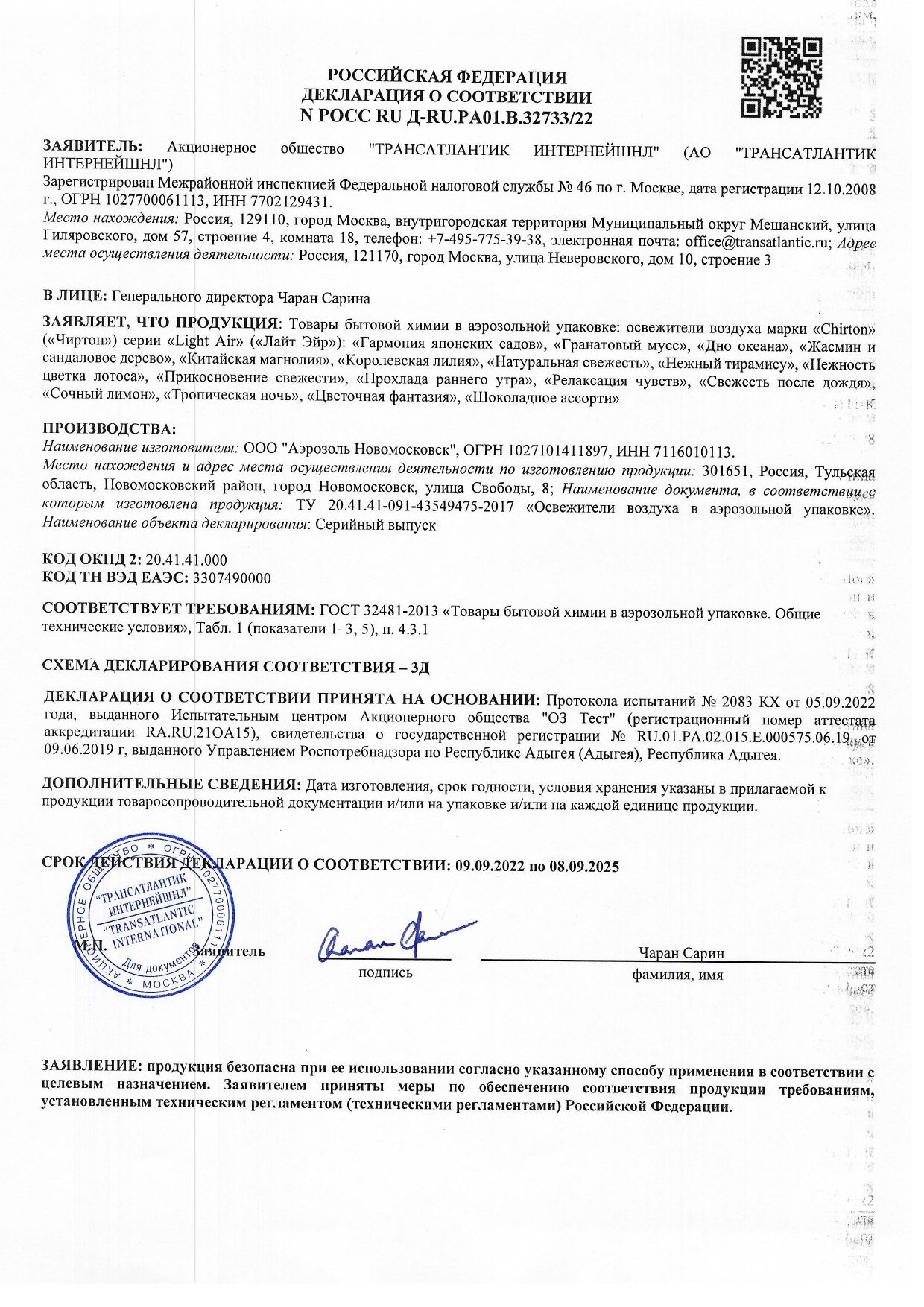 Состав: пропан/бутан/изобутан (30% и более), растворитель (менее 5%), парфюмерная композиция (менее 5%), эфирные масла (менее 5%).