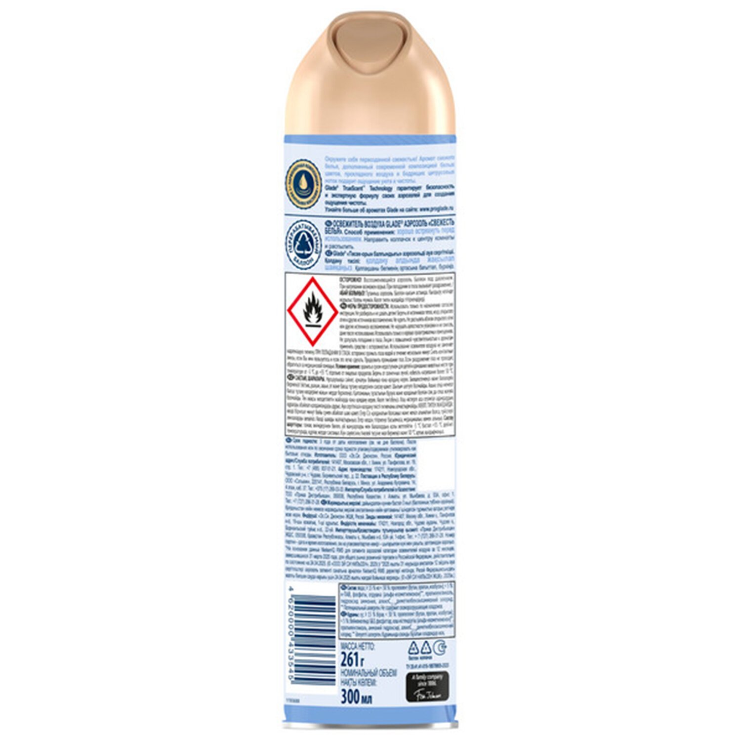 Аромат свежего белья, дополненный современной композицией белых цветов, прохладного воздуха и бодрящих цитрусовых ноток. Glade гарантирует безопасность и экспертную формулу своих аэрозолей для создания ощущения чистоты.