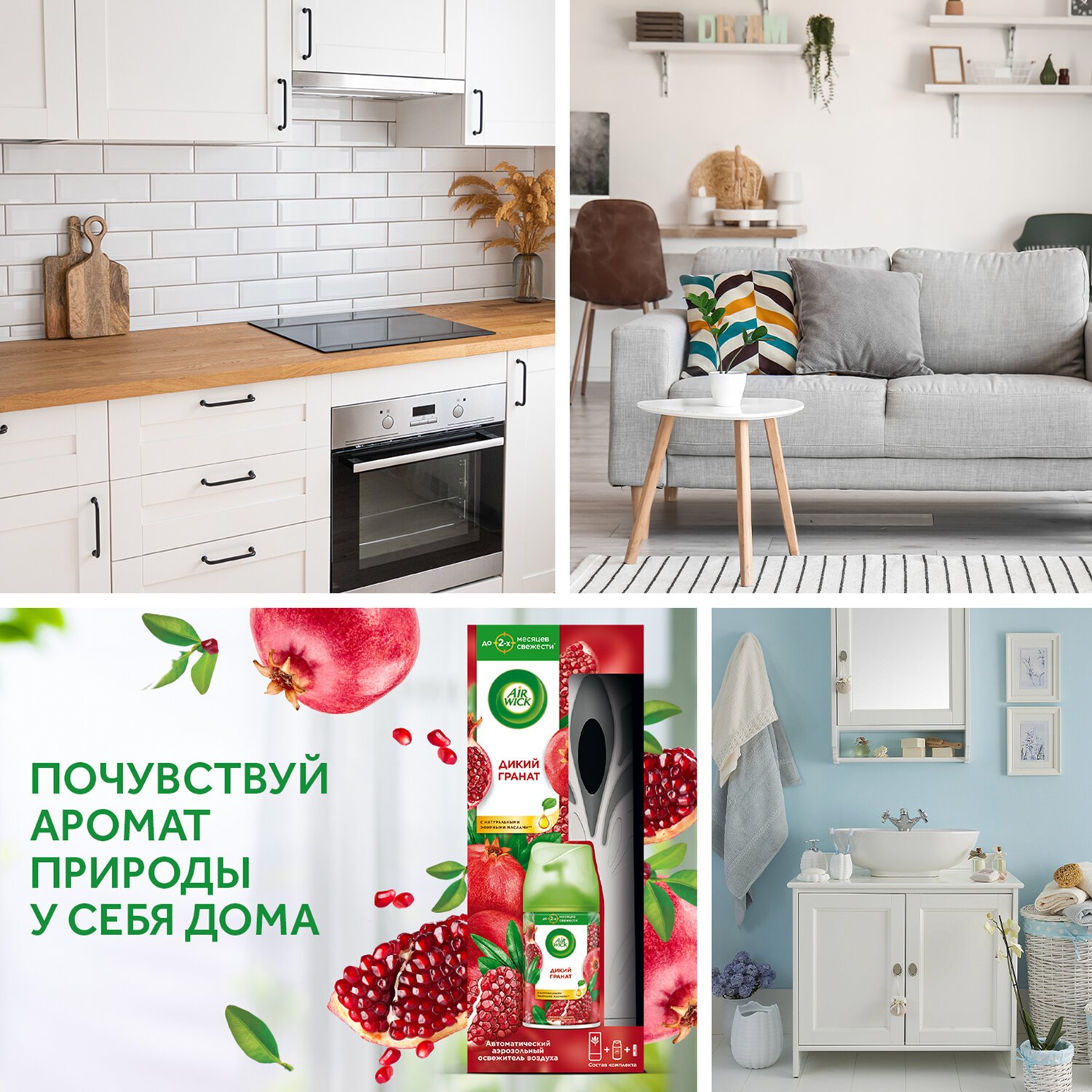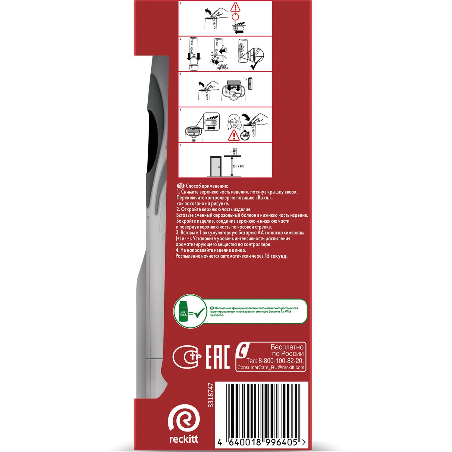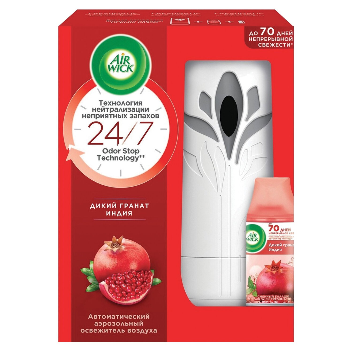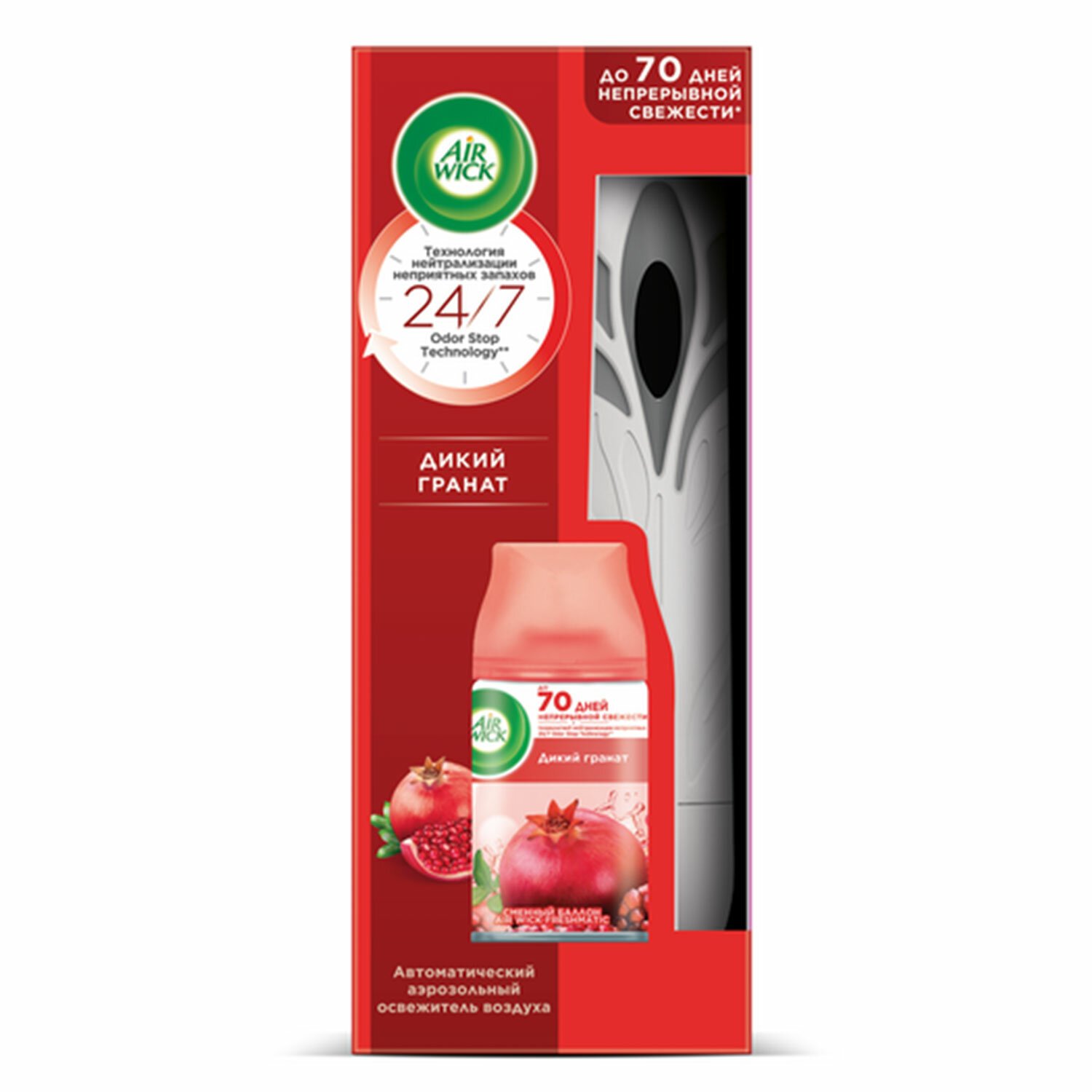 Автоматический распылитель освежителя воздуха AIRWICK Freshmatic с освежителем воздуха в сменном аэрозольном баллоне "Дикий гранат". Самостоятельно распыляет аромат и эффективно устраняет любые неприятные запахи.