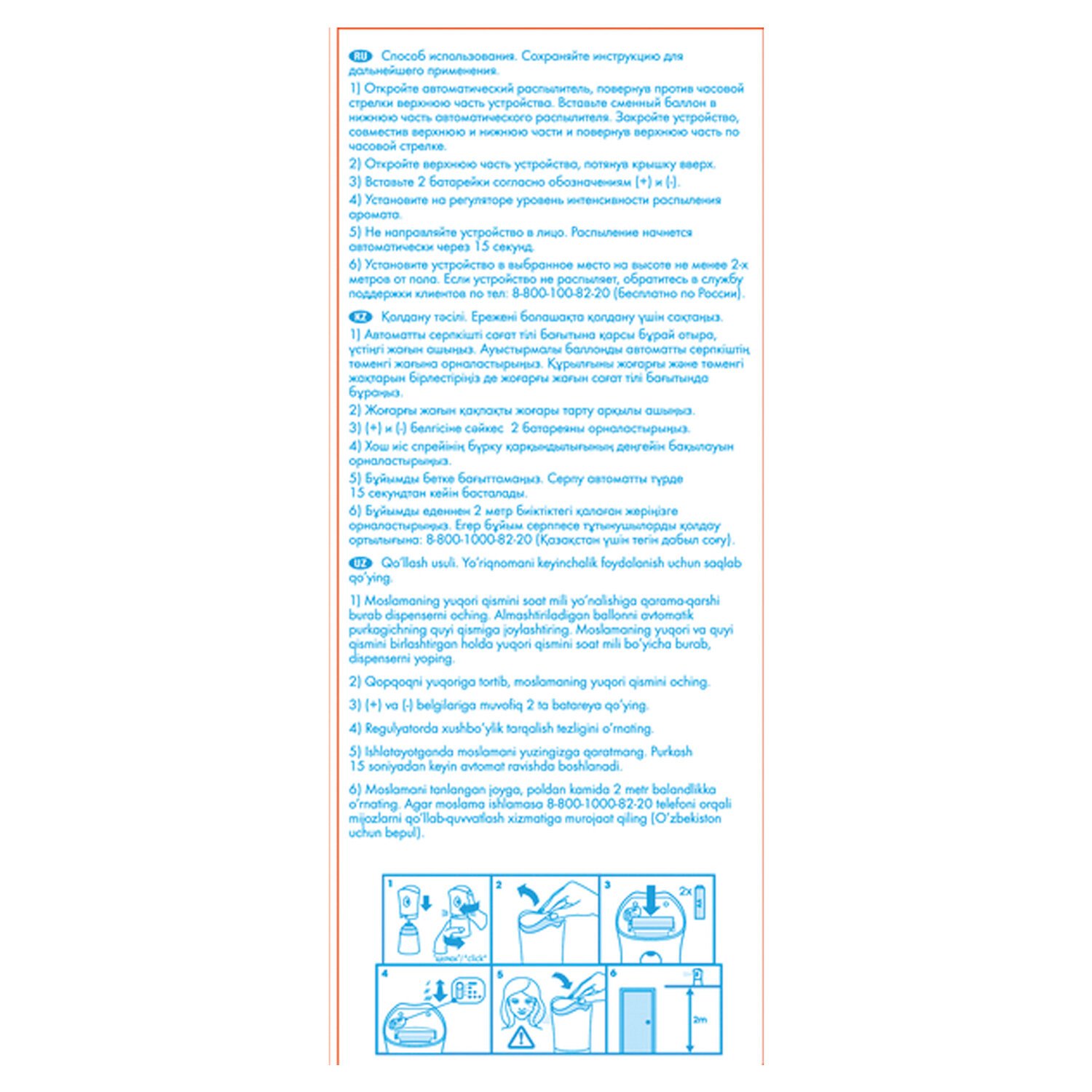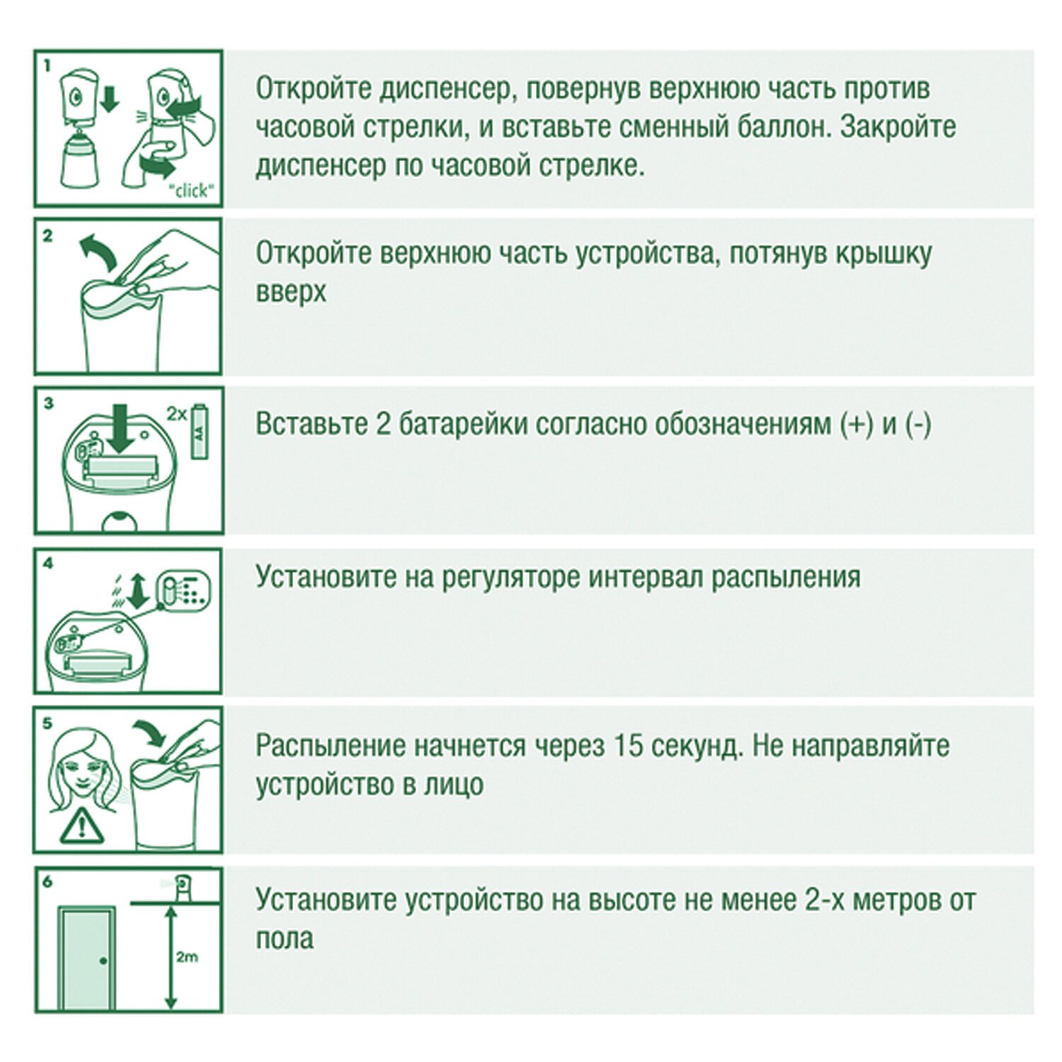 Предназначен для автоматической ароматизации воздуха и удаления неприятных запахов в помещениях (офисе, ресторане, туалете, помещении для курения) путем распыления освежителя воздуха из аэрозольного баллона. Работает от батареек АА/LR6.