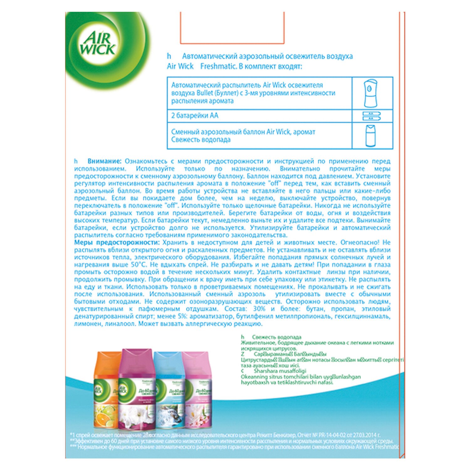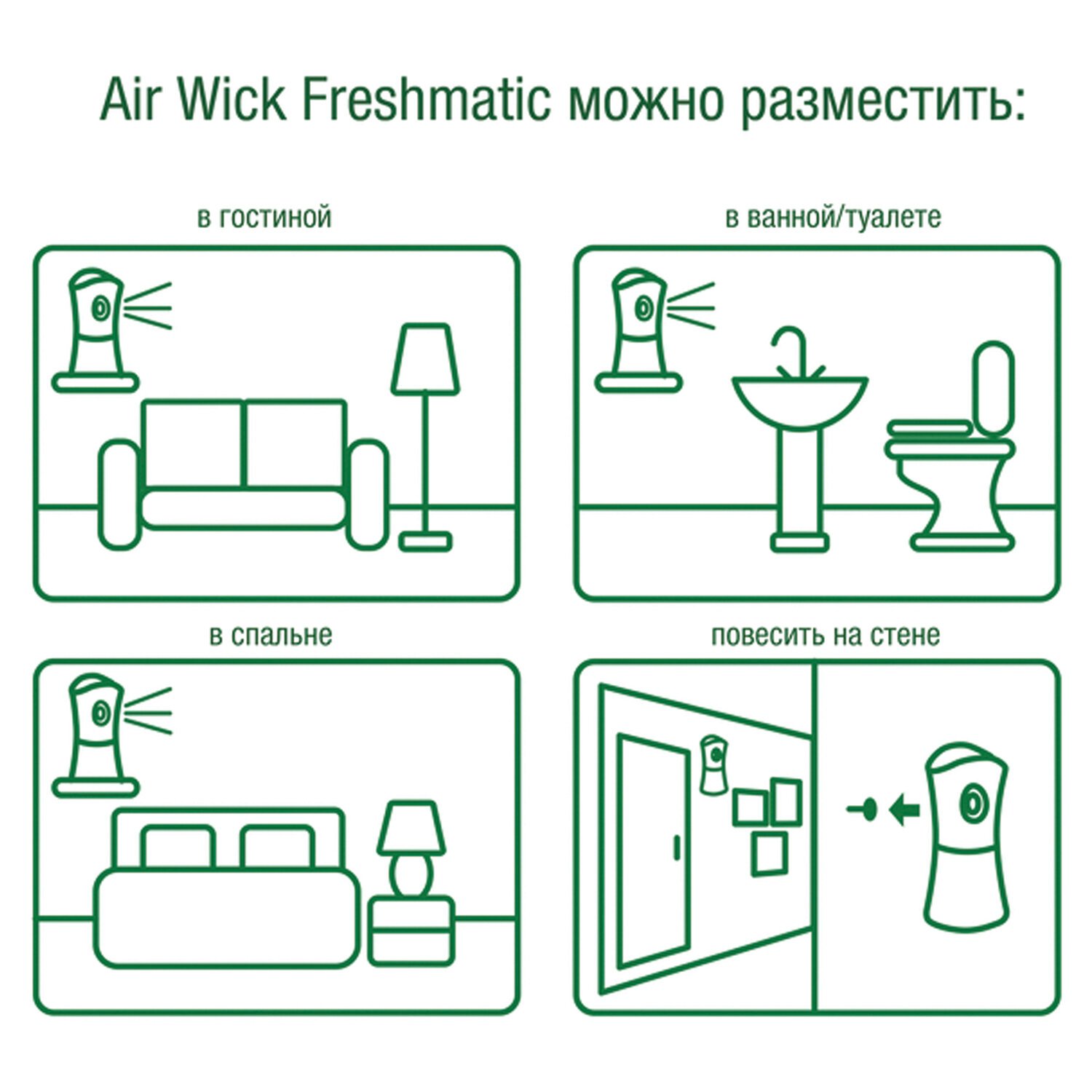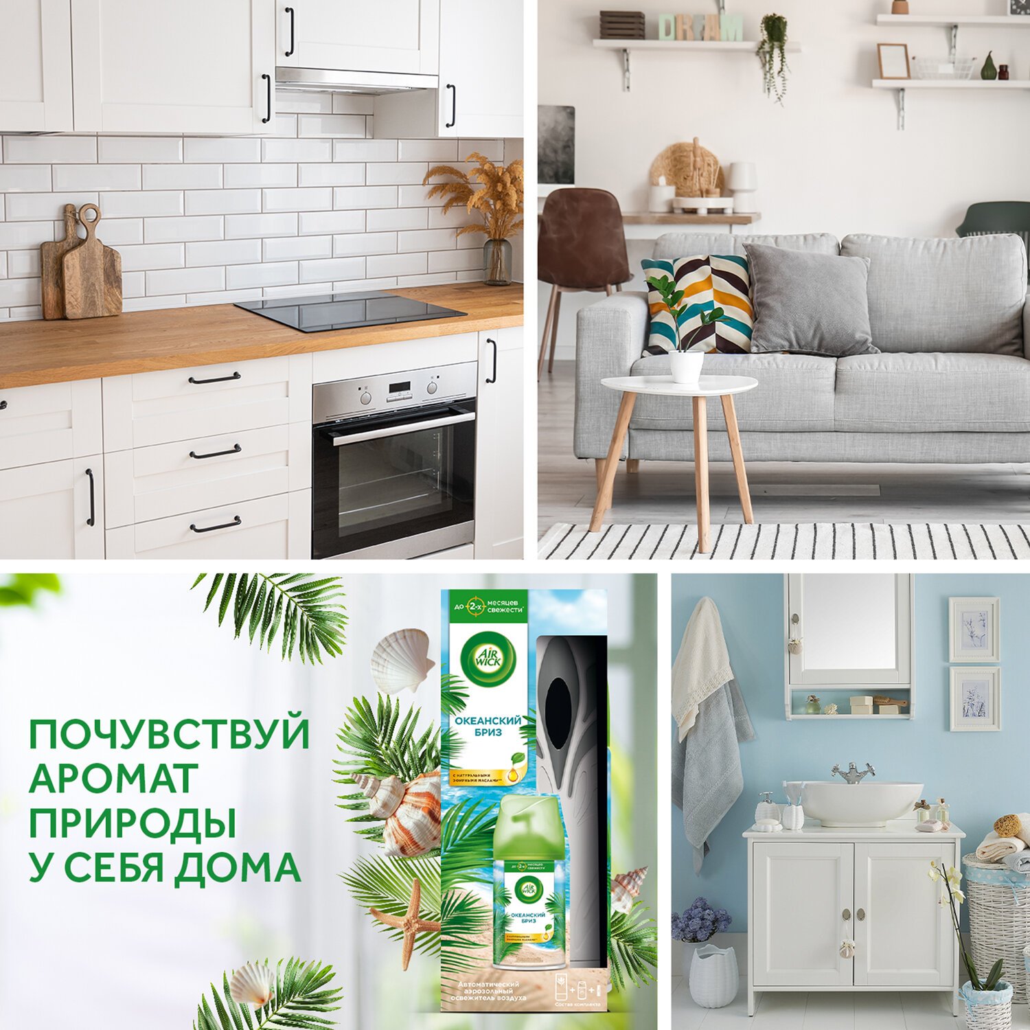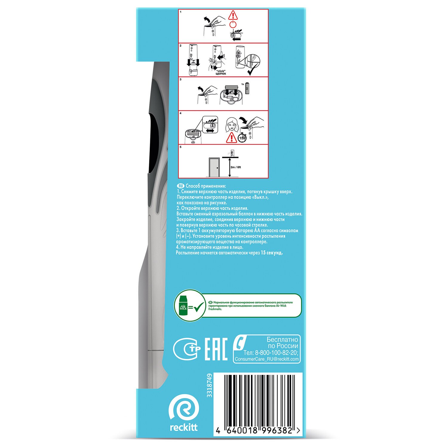 Автоматический распылитель освежителя воздуха AIRWICK Freshmatic серии Life Scents с освежителем воздуха в сменном аэрозольном баллоне "Океанский бриз". Самостоятельно распыляет аромат и эффективно устраняет любые неприятные запахи.